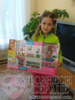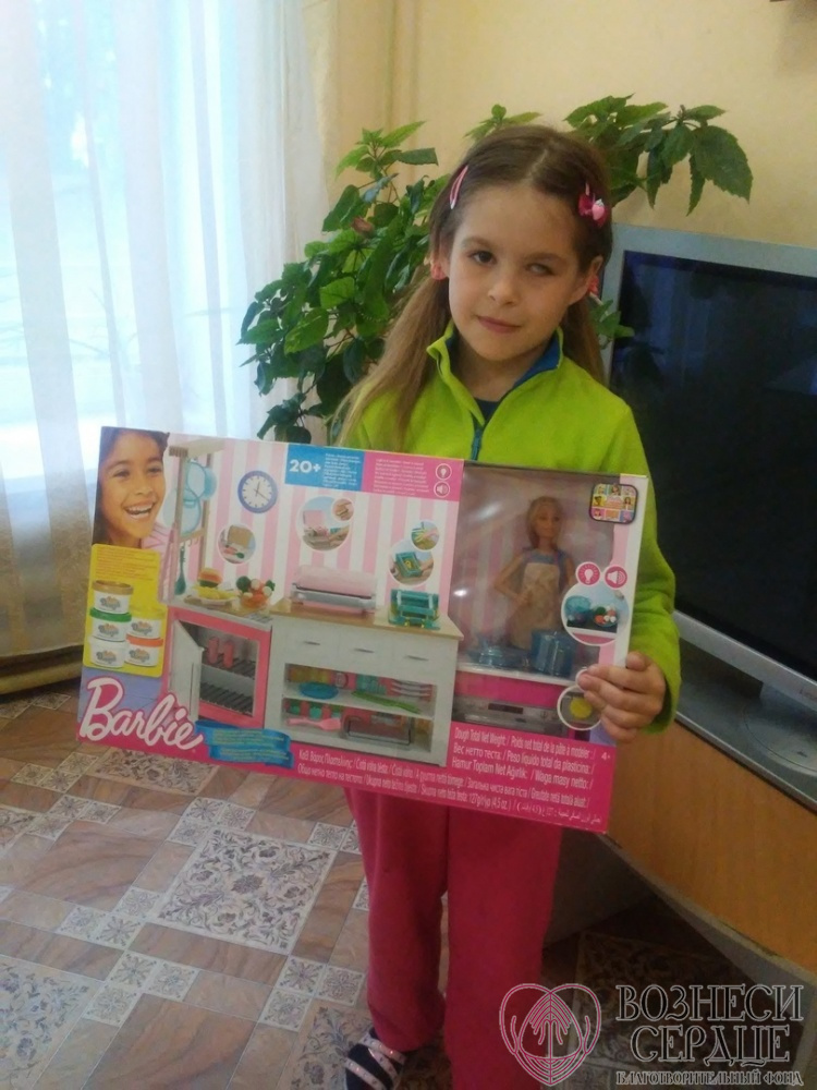 Аникина Полина из малоимущей многодетной семьи (5 деток), и недавно у них умер папа, поэтому подарок от Натальи стал именно той радостью, которой давно не было в жизни девочки. А о такой красивой детской кухне мечтает каждая маленькая хозяюшка! А здесь ещё и кукла Барби.