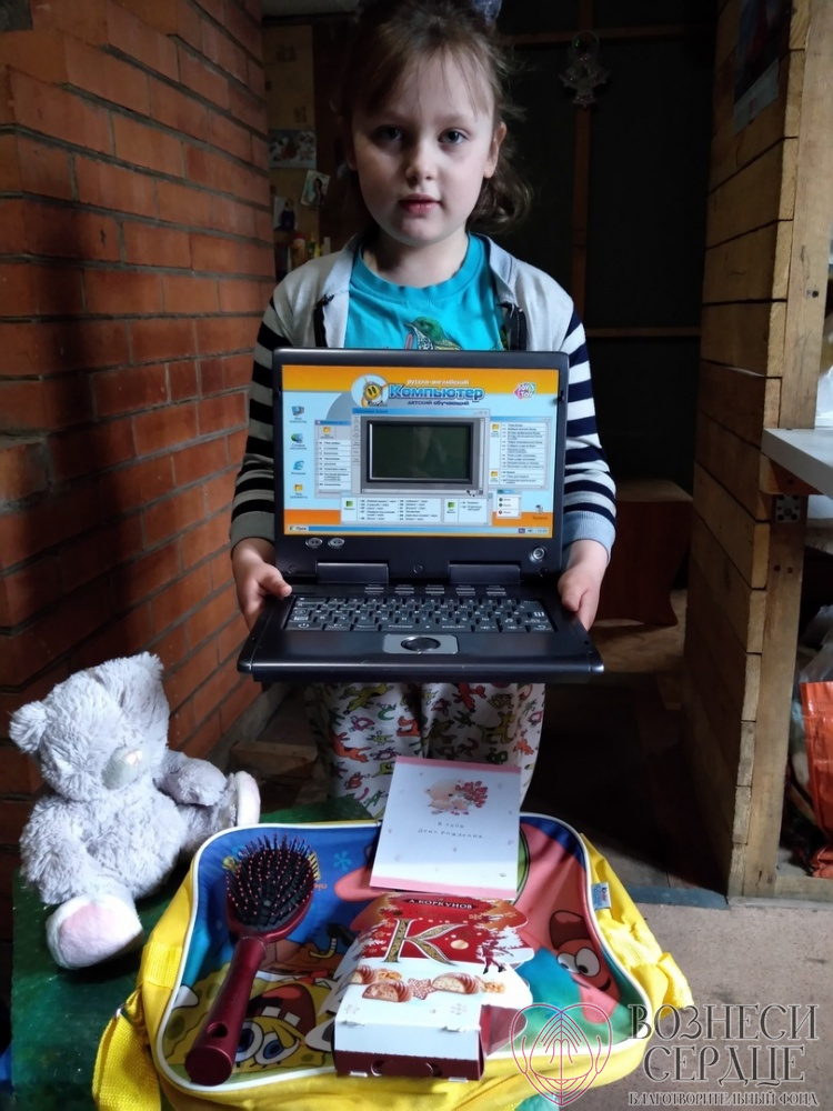 Девочка уже прошла реабилитацию в детском центре, и сотрудники привезли ей подарок домой. Вот была радость! О таком умном обучающем детском компьютере девочка давно мечтала. Теперь она с удовольствием выполняет разные интересные задания, узнаёт новое и проводит время с пользой!