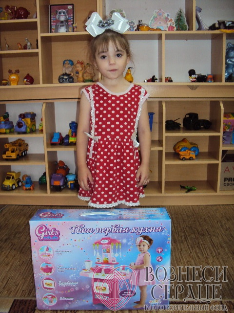 Добрая Виктория порадовала и Карину Абдуллаеву. Посмотрите, какая шикарная кухня теперь у девочки и красивый бант на голове. Карина о такой кухне и мечтать не могла, для неё это был сюрприз! Теперь она готовит обед кукле и детство у неё продолжается, несмотря на сложную жизненную ситуацию.