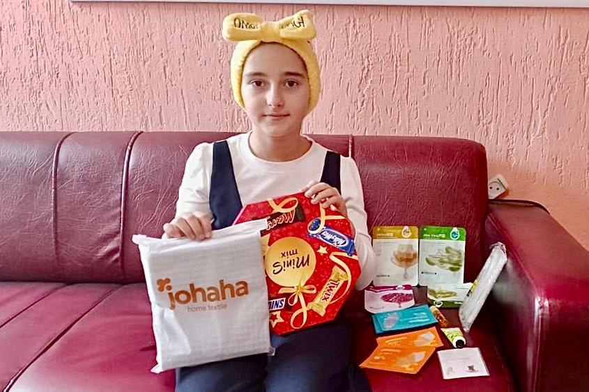 Катя мечтала получить в подарок на день рождения ассорти из подарочков: набор уходовой косметики для лица, кухонные полотенца, чехол на телефон и стикеры. Её список желаний исполнила заботливая фея Светлана.