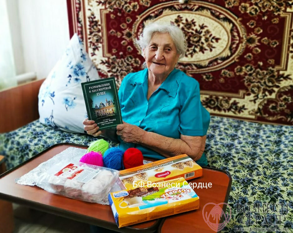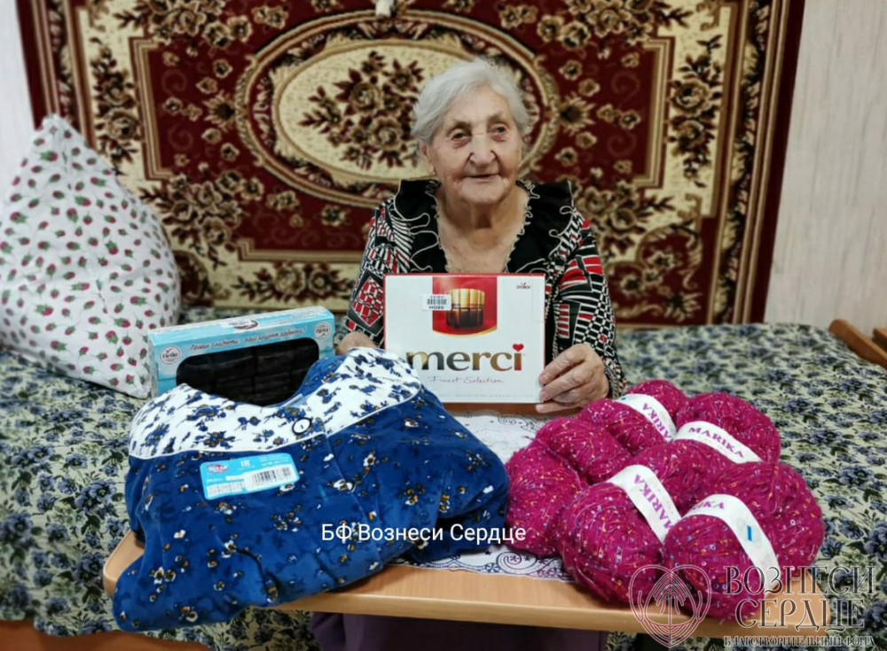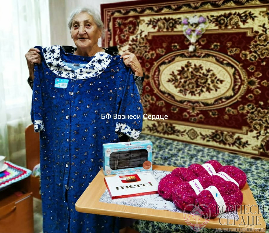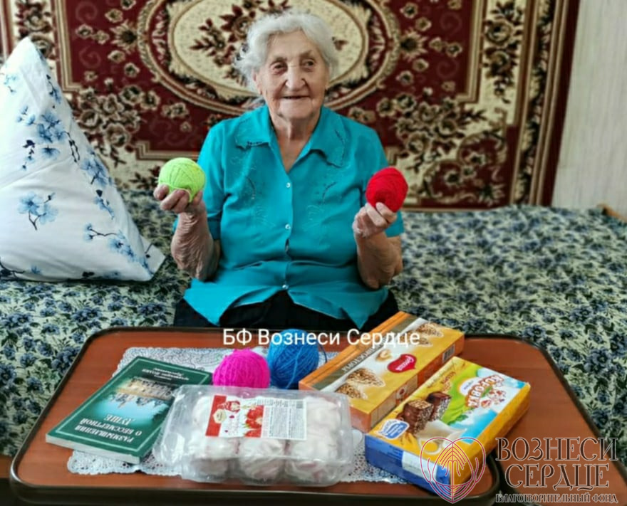 Бабушке исполнилось 86 лет. Она от всей души благодарит щедрых девушек за внимание к ней. Подарки ей очень понравились. Она уже с удовольствием начала вязать варежки.