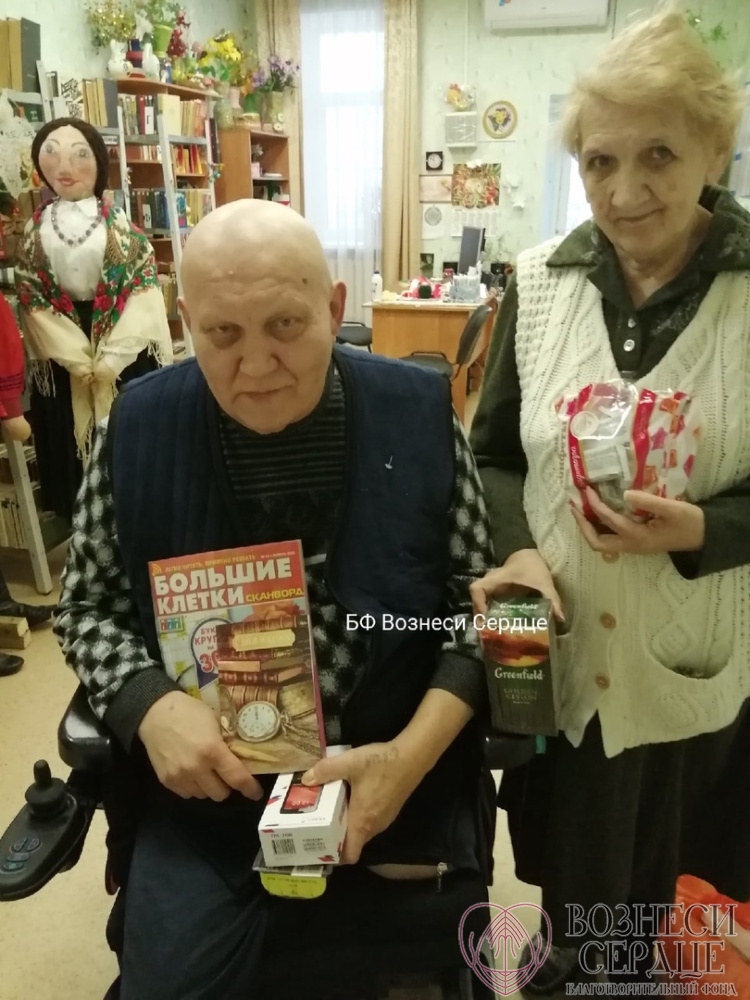 Сегодня добрая волшебница из г. Москва одарила Николаева Александра Петровича и Бурцеву Татьяну Лазоревну . Она прислала огромную посылку с двумя подарками. Александру Петровичу прислала его долгожданный телефон, наушники, тёплую телогрейку, сканворды и угощение к чаю. А Татьяне Лазоревне платье с длинными рукавами, тепленькие носочки и угощение к чаю.