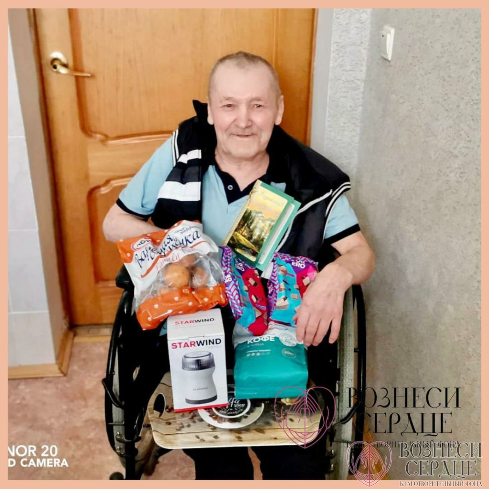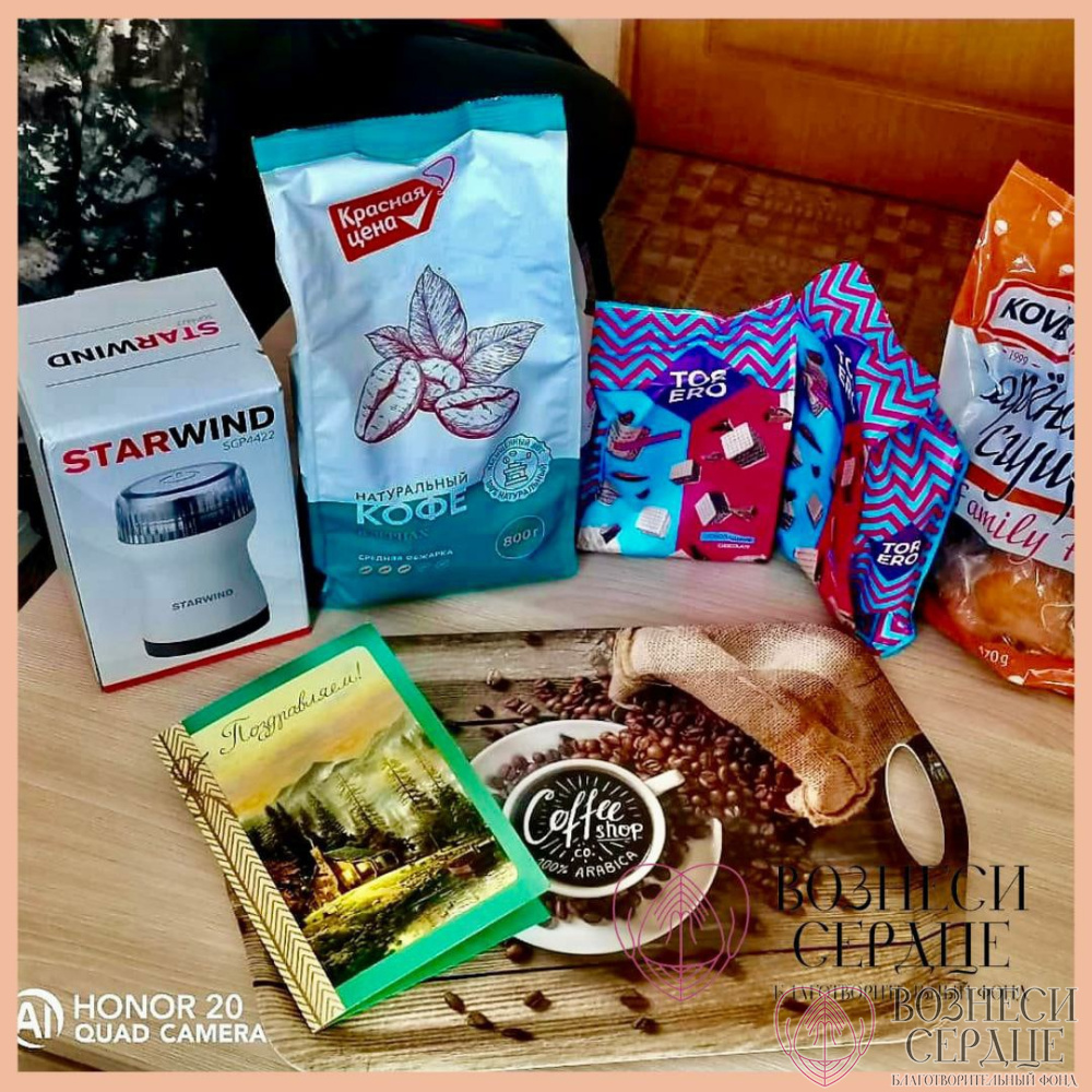 Новиков Анатолий Ильич тоже получил поздравительную открытку, мини-маффины с варёной сгущёнкой, 2 упаковки шоколадных вафель, поднос, упаковку натурального кофе и долгожданную кофемолку.