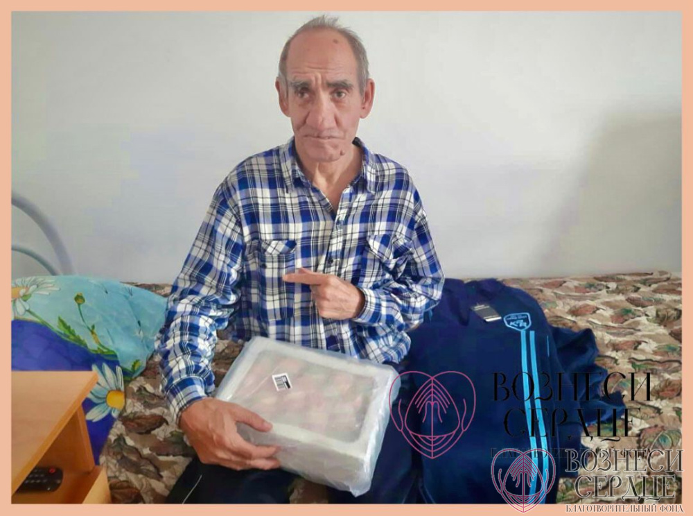 Коннов Василий Петрович обрадовался спортивному костюму и сладостям.