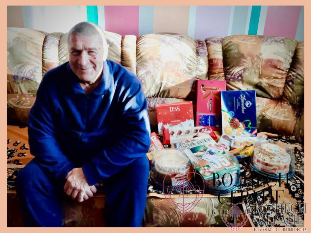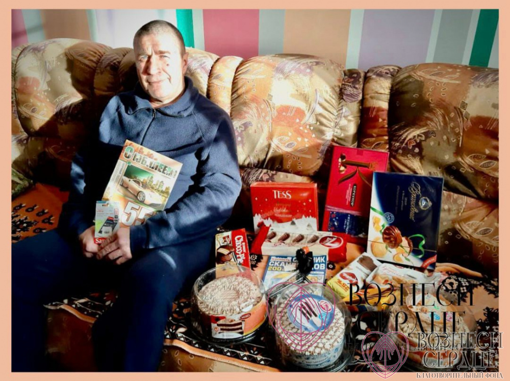 Гнусов Владимир Николаевич получил подарок от Алины Владимировны из г. Кемерово. Его мечта исполнилась. Он получил в подарок карту памяти, три торта, большой сканворд, сувенир, ручку красивую, большую открытку с наилучшими пожеланиями и много сладостей. Он очень рад был подарку. Поступил он к нам недавно, поэтому был очень удивлён этому чудесному проекту. Спасибо Алине за праздник, который она ему организовала. Благодаря ей состоялось чаепитие с тортами в кругу его новых друзей».