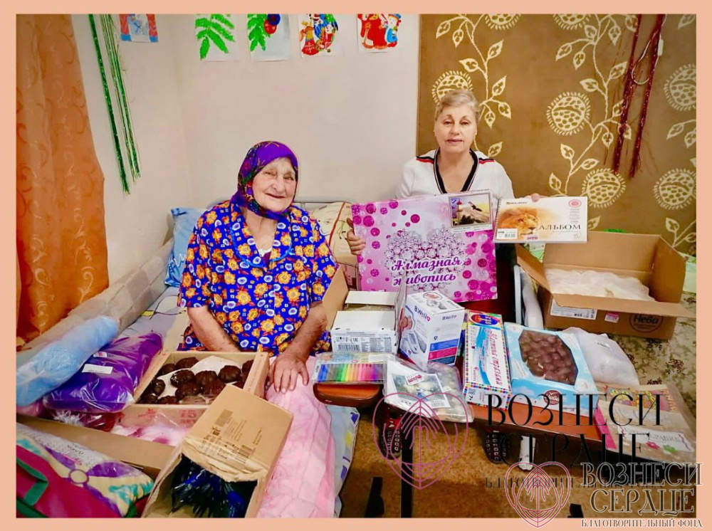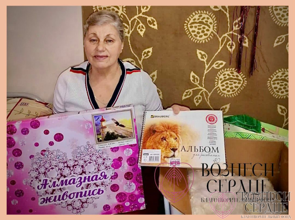 «Добрая фея» Ксения из г. Москвы прислала подарочки двум нашем сестричкам: Агаповой Вере Николаевне и Масловой Александре Николаевне. Курьер привёз много пакетов с подарками (24 позиции). Нитки для вязания, 4 картины «Алмазная мозаика», картинка для раскрашивания, фломастеры, чай, тонометр электронный, мягкий плед, альбомы для рисования, много-много сладостей. В комнате для двух бабушек и их гостей я устроила чаепитие с тортиком. Вера Николаевна – наша рукодельница: вяжет крючком цветы, салфетки, перерисовывает картинки и раскрашивает их, участвует во всех наших мероприятиях. Я исполнила весёлые песни, пока гости пили чай. Спасибо Ксения за Ваше доброе отношение к пожилым людям. И пусть Ваши добрые дела вернутся к Вам сторицей. С Новым 2022 годом!»