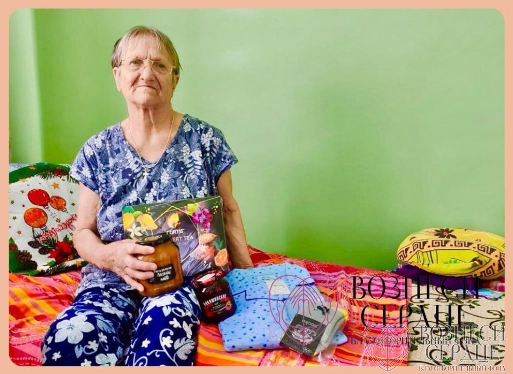 В феврале ей исполнилось 85 лет. Поздравили её с юбилеем Светлана и Владимир из г. Москвы. Прислали ей пижаму, носки, мёд, варенье и чай. Очень довольна именинница, особенно понравился цвет пижамы, как она и хотела – голубой.