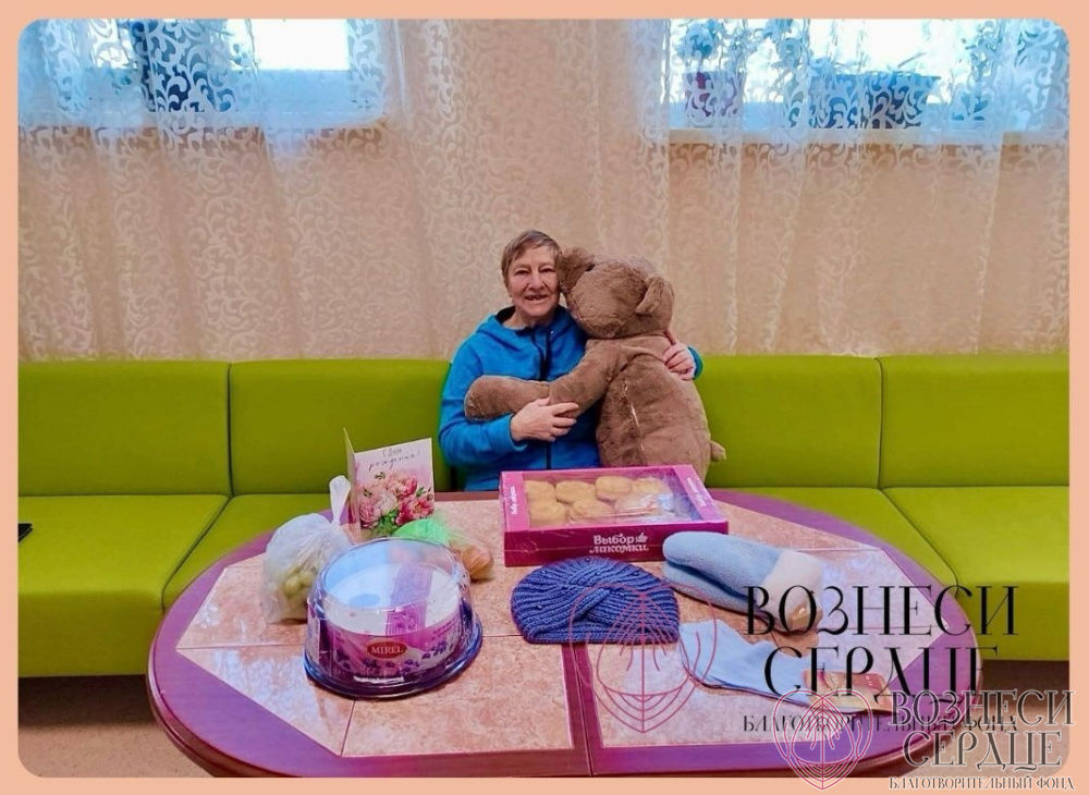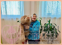 «Сегодня, 19 февраля, свой 77-ой День рождения отмечает проживающая дома-интерната Галина Алексеевна Беляева. В этот праздничный день нашу именинницу спешит поздравить с Днём рождения даритель БФ «Вознеси сердце» Полина из г. Екатеринбурга. Галину Алексеевну ждала посылочка с подарками - огромный симпатичный мишка и кондитерские изделия, а также прекрасное стихотворение-поздравление: