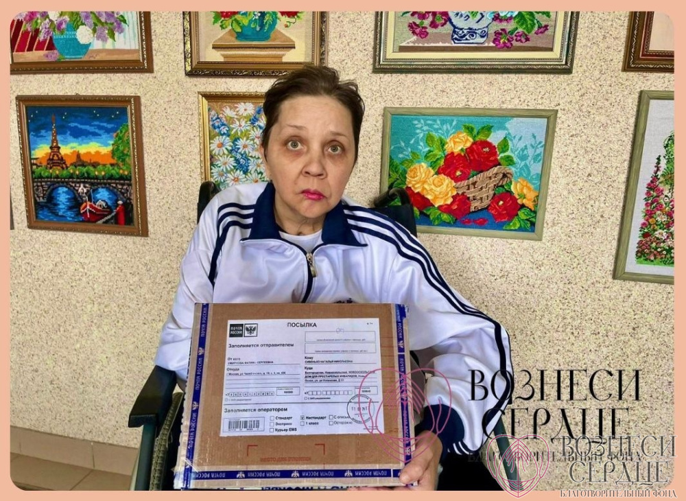 «В Донецкий дом - интернат пришла посылка для Завяловой Елены Дмитриевны. Добрая волшебница Инна прислала для именинницы мольберт, карандаши, шампунь и сладкий гостинец. Елена Дмитриевна была счастлива и тронута таким вниманием и заботой. Благодарила, передавала пожелания здоровья БФ "Вознеси Сердце" и добрым людям, которые заботятся о пожилых людях и дарит им радость и надежду».