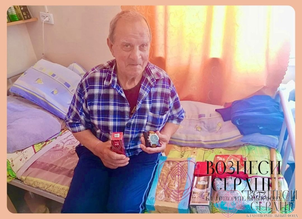 Мекина Александра Кирилловича поздравила Наталья, которая осуществила его мечту, подарив наручные часы. Также его обрадовали туалетная вода, чай и сладости.