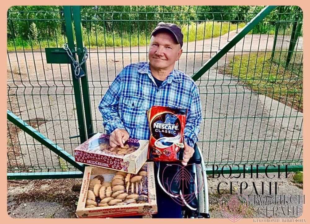 Сергеев Вячеслав Петрович из Гривского дома-интерната благодарит добрую Анну за щедрые подарки ко дню рождения. Дарительница прислала кроссовки, кофе и сладости. Имениннику всё понравилось, он очень рад.