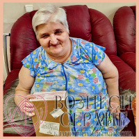 С днем рождения поздравили Стрельцову Любовь Максимовну. Плохо видит наша именинница, но всегда весёлая и любит слушать музыку. Женскую сорочку и сладости для диабетика подарила Любовь Максимовне Ольга