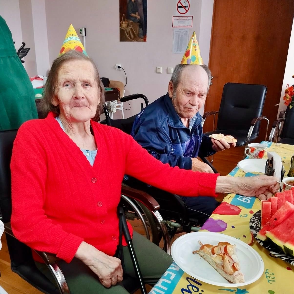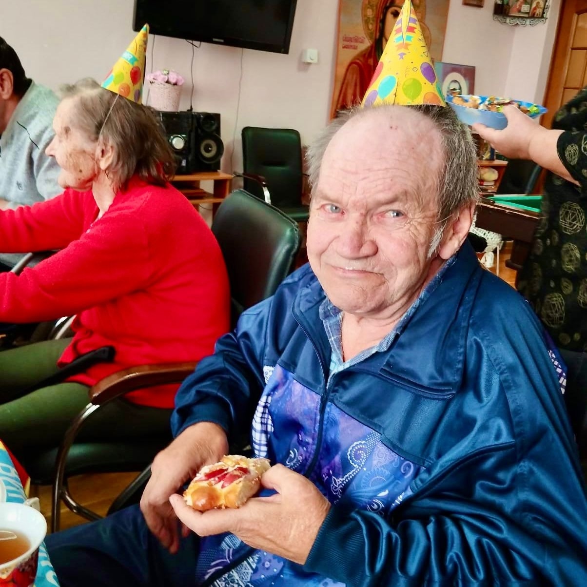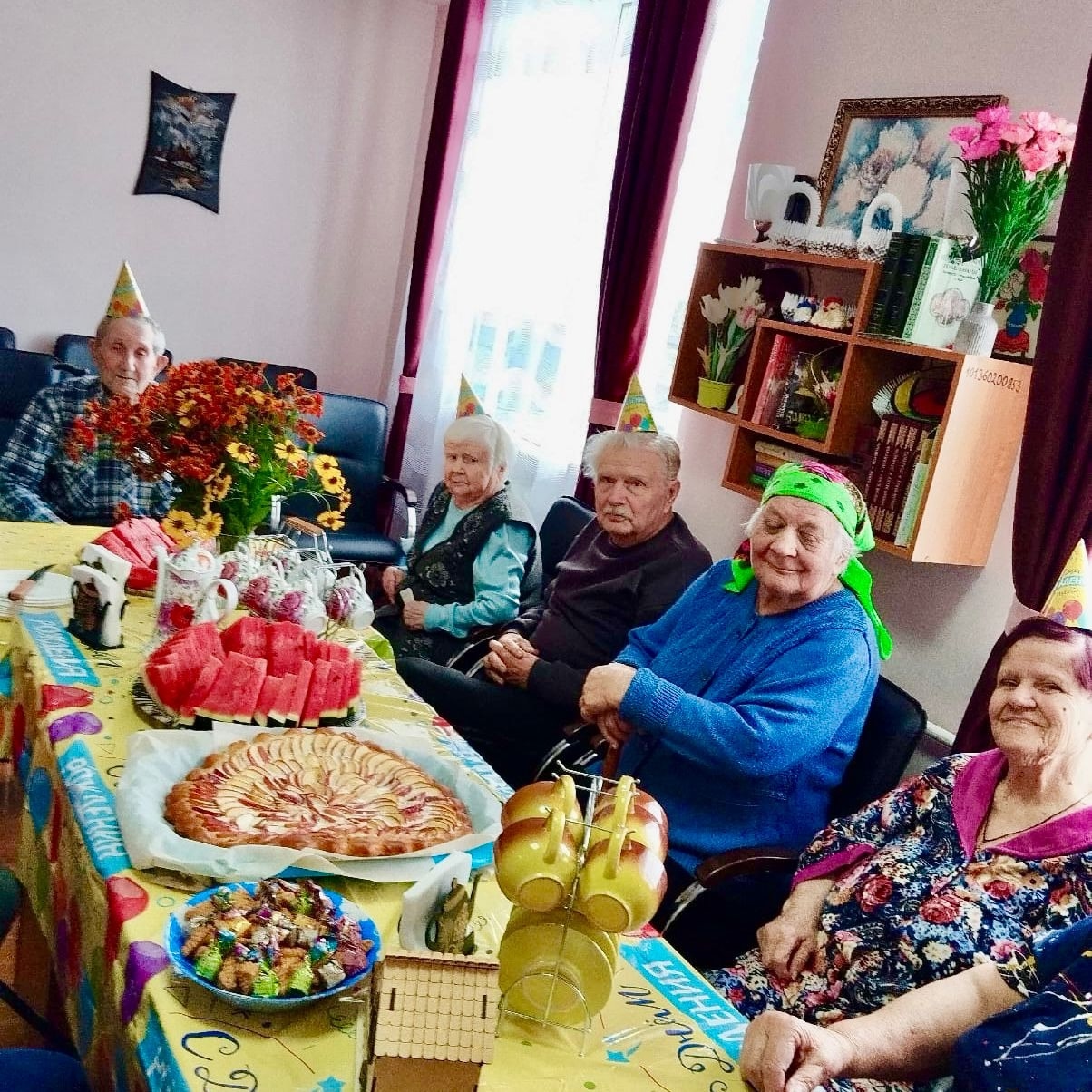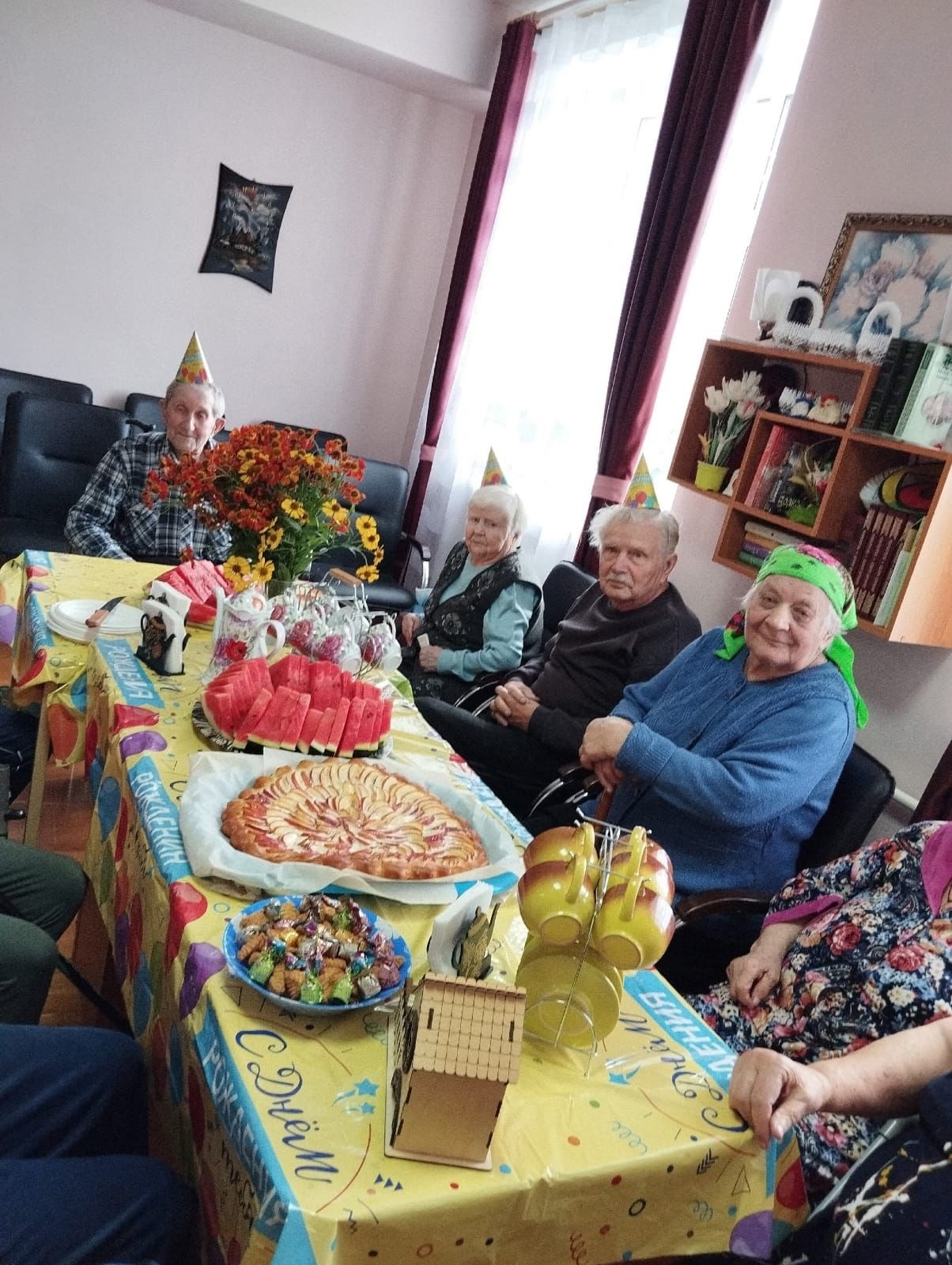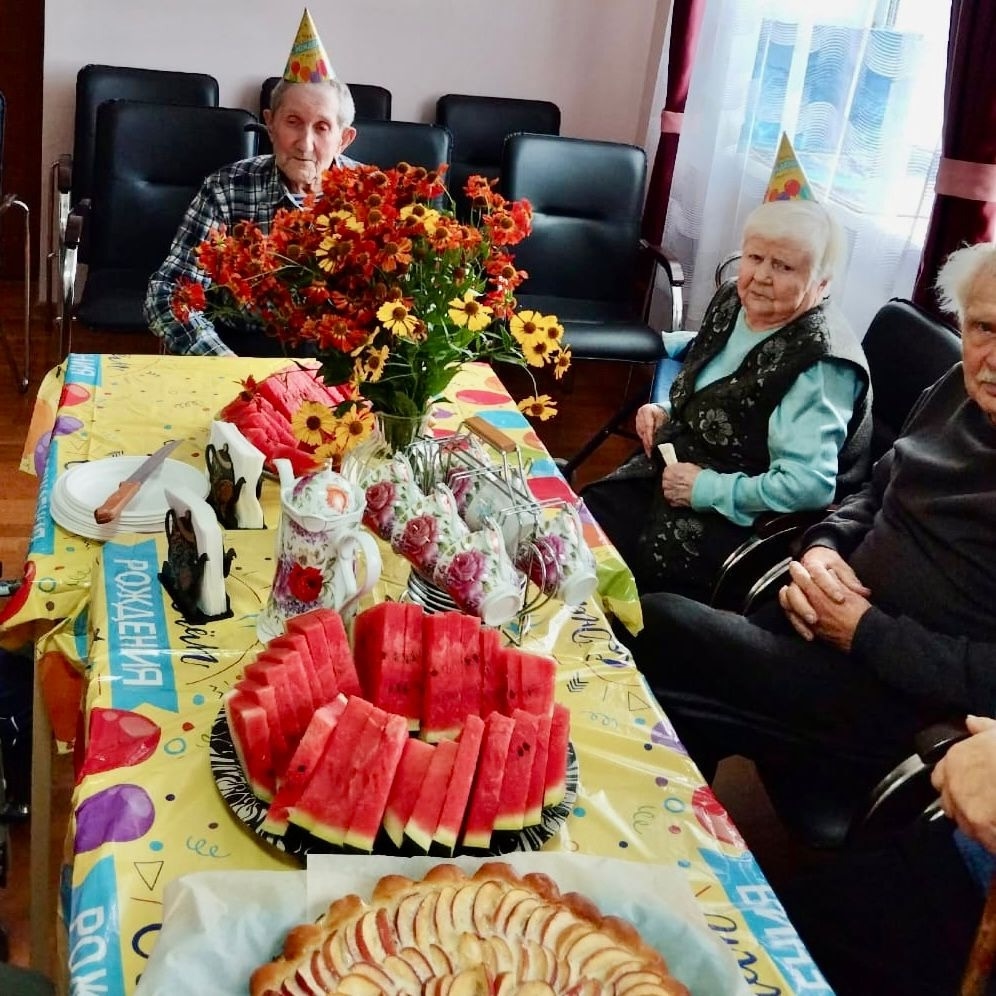«За праздничным столом собрались его друзья и соседи по комнате! Шикарный пирог испекли для именинника кулинары из МК "Гдовский". На столе были конфеты, печенье и сахарный арбуз. За угощения мы благодарим БФ "Вознеси Сердце" и дарительницу Анастасию. А дедушке мы желаем здоровья и долголетия».