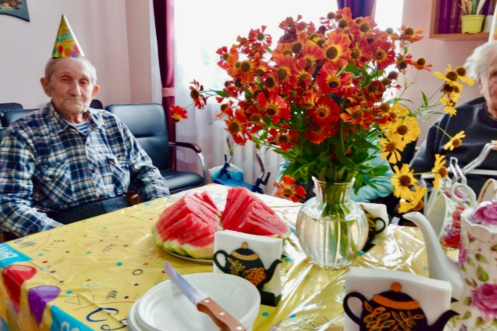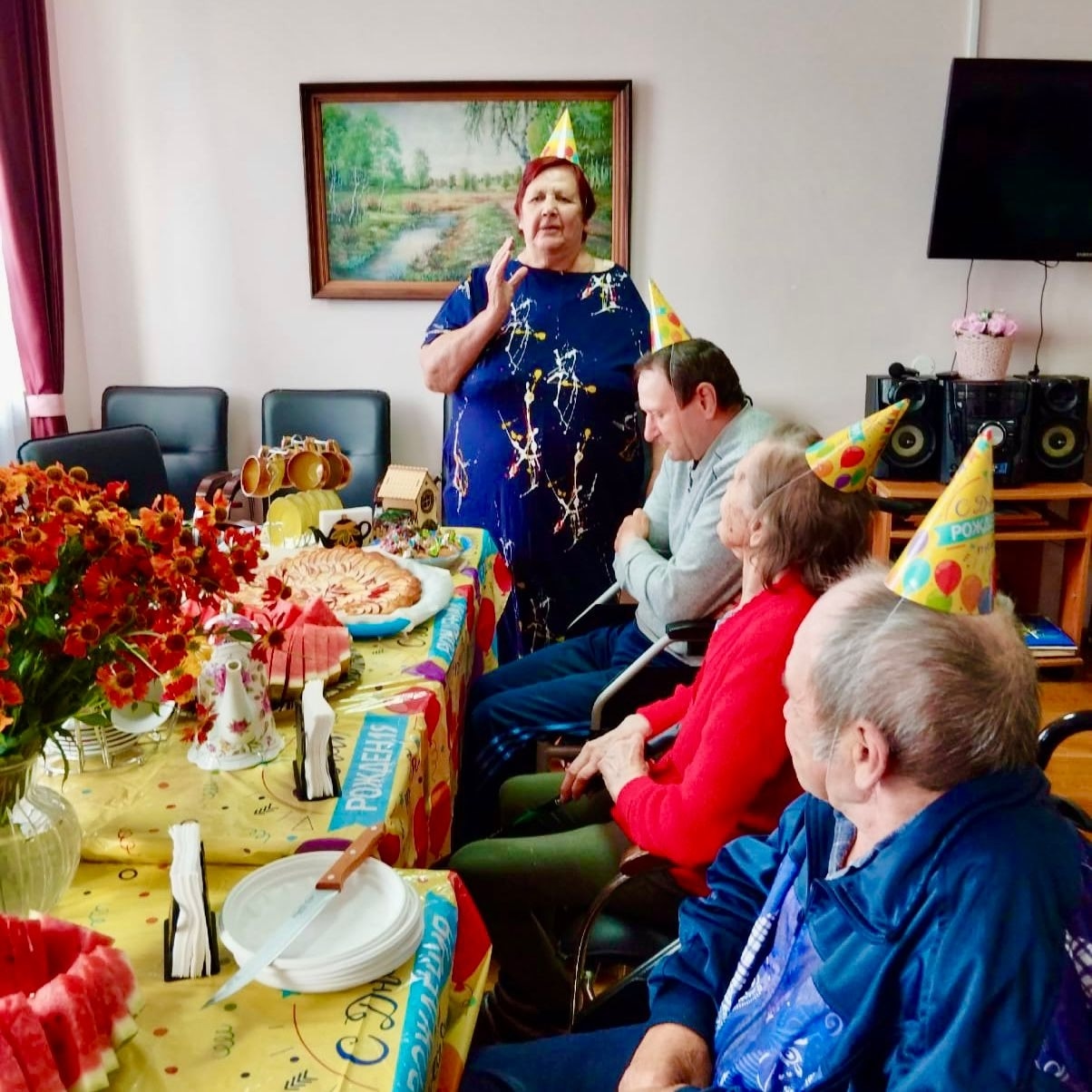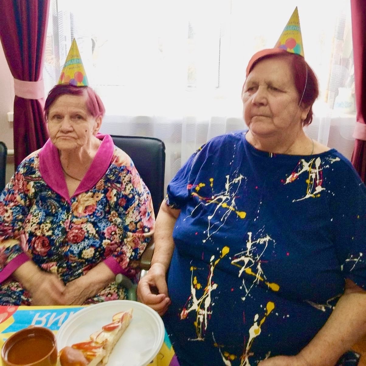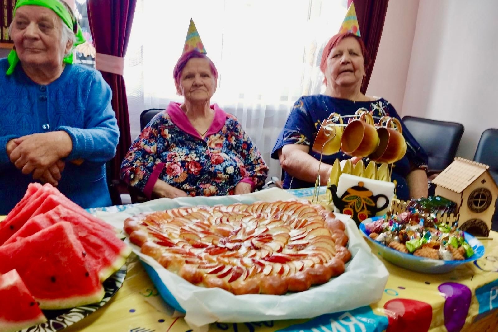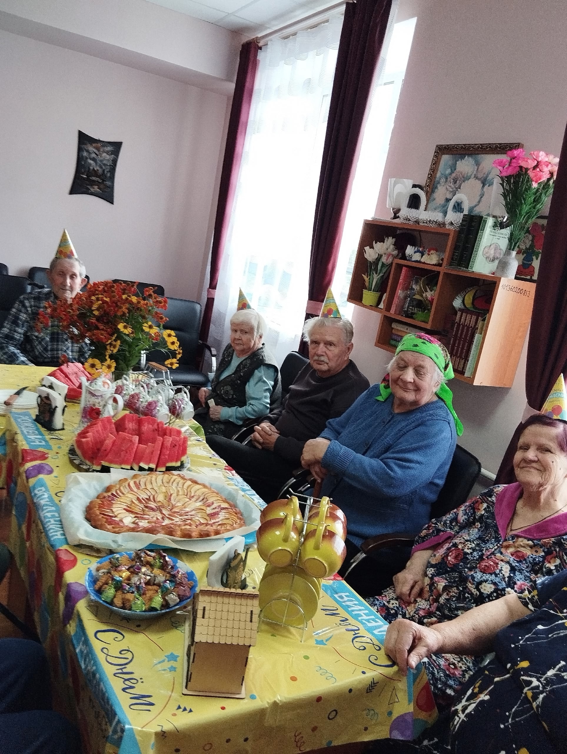 «За праздничным столом собрались его друзья и соседи по комнате! Шикарный пирог испекли для именинника кулинары из МК "Гдовский". На столе были конфеты, печенье и сахарный арбуз. За угощения мы благодарим БФ "Вознеси Сердце" и дарительницу Анастасию. А дедушке мы желаем здоровья и долголетия».