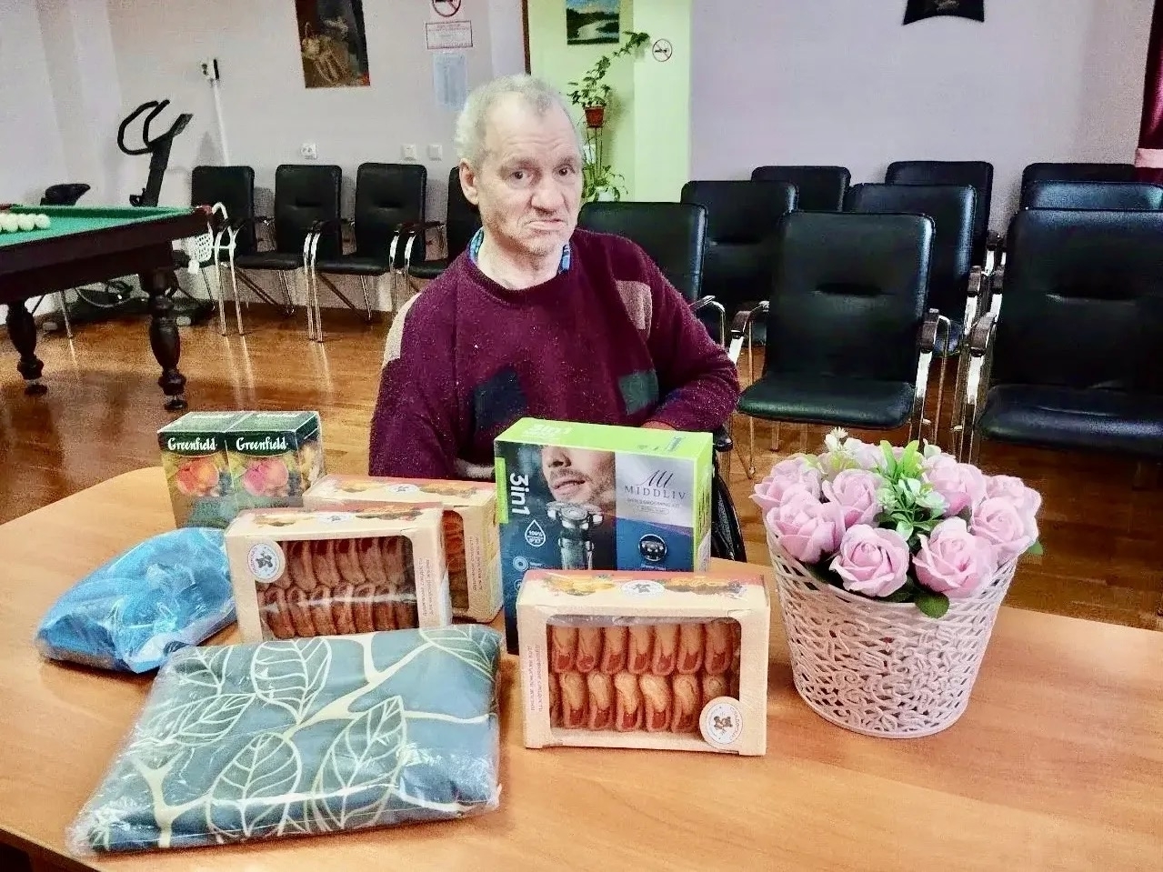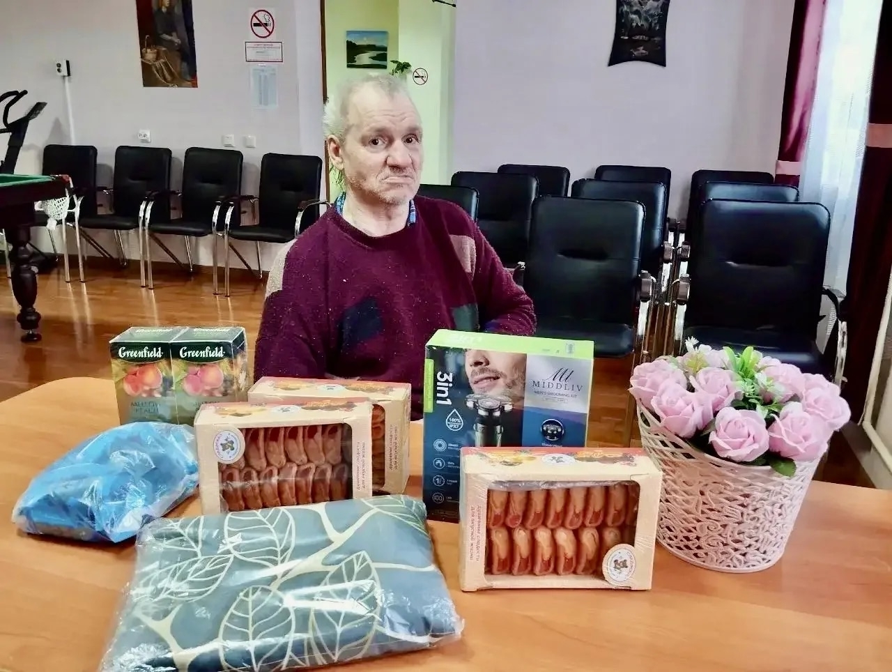 Щедрые дарительницы Анастасия и Валентина прислали именно то, что было необходимо: электробритву, простынь на резинке и целый запас сладостей. Виктор Петрович очень рад такому количеству подарков и благодарит каждого причастного.