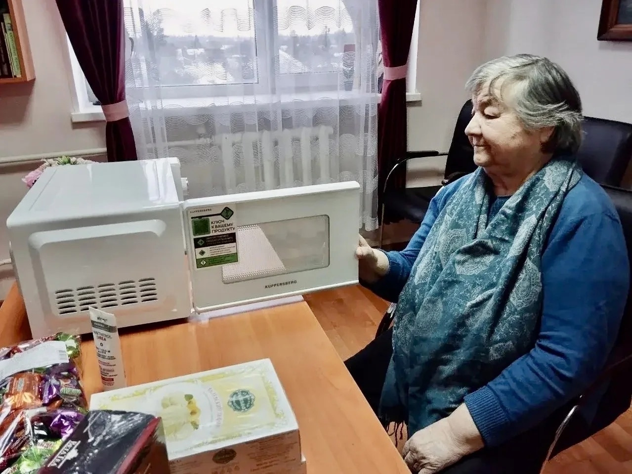 Но на этом сюрпризы не закончились! К праздничному столу Надежде Дмитриевне прислали любимые лакомства: вкусные конфеты, нежный зефир и ароматный чай. А для заботы о себе - крем для рук. Бабушка очень тронута таким вниманием.