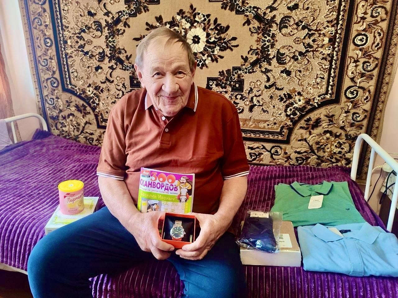 Благодаря «волшебнице» Дарье у него теперь есть всё для комфорта и досуга: новые футболки-поло, наручные часы, сканворды, носки и, конечно, угощения. А еще одна дарительница прислала Александру Васильевичу футболку, так что теперь у него отличный запас любимых вещей.