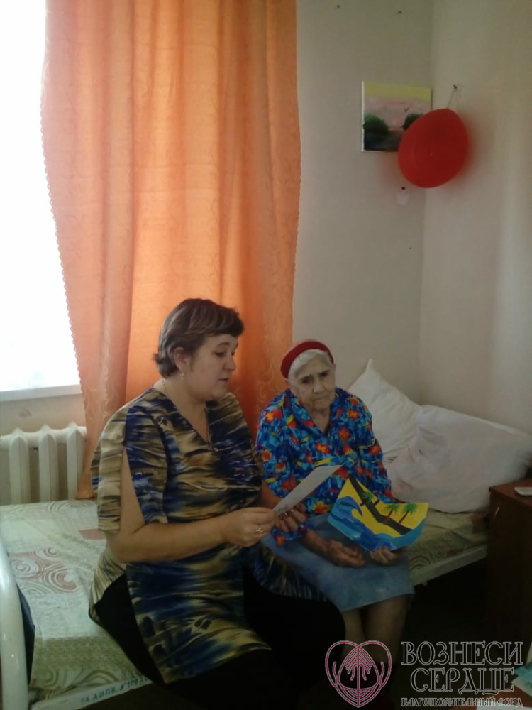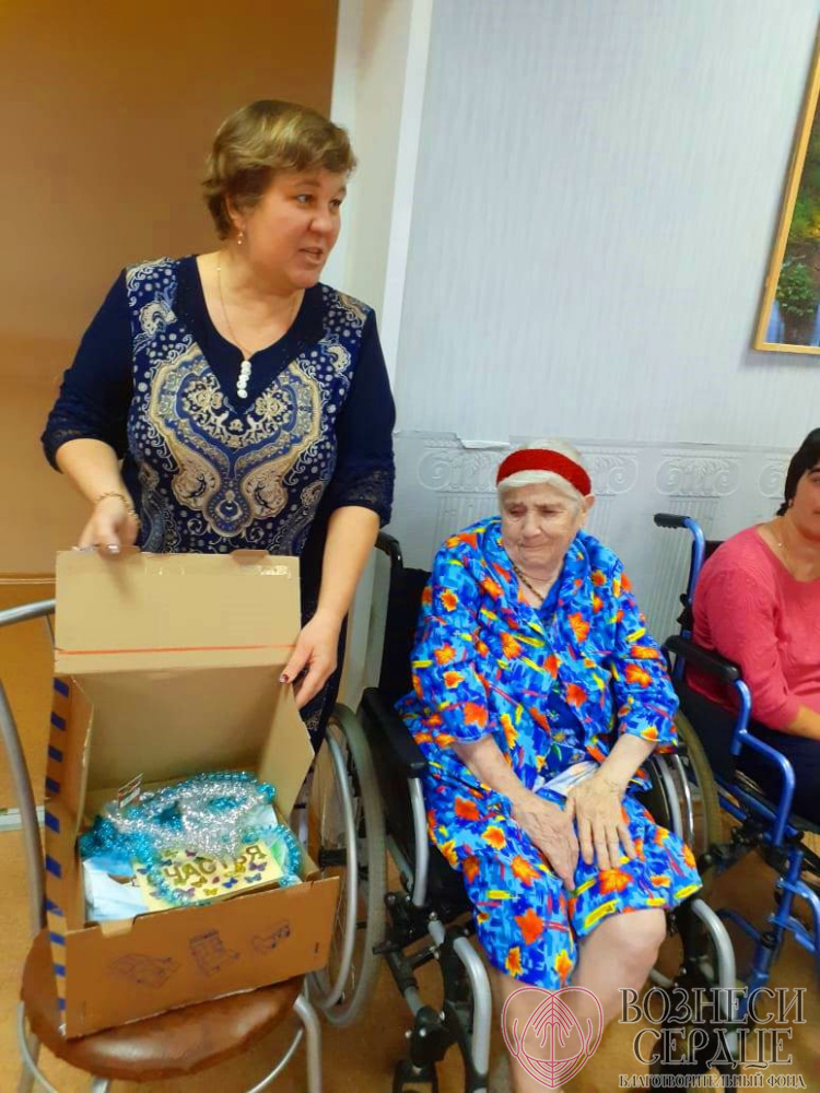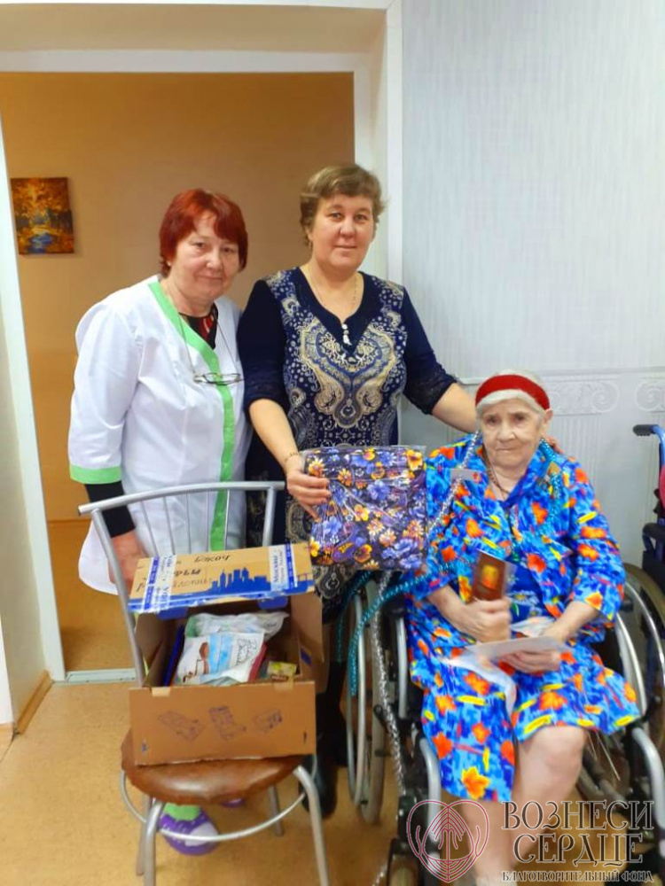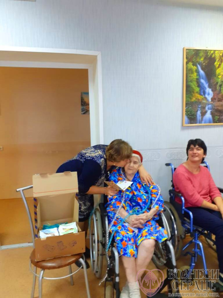 «Сегодня мы поздравили нашу именинницу Бокоч Агафью Михайловну. Ко дню рождения Шульгина Светлана Владимировна из г. Москва, благодетельница БФ «Вознеси сердце», прислала посылочку, в которой лежали: тёплый халат, православная иконка, мишура, много сладостей, открытка «С днём рождения!». Бабушка плакала от счастья, когда мы распаковывали её подарочек. Она очень была рада своей новой вещи в гардеробе, иконке и сладостям. «Как я благодарна незнакомой мне женщине, Светлане. Я буду молиться, чтобы Бог ей послал много счастья и здоровья!» - с радостью сказала именинница.