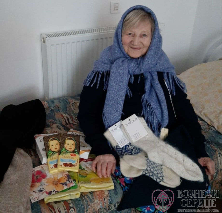 Добрая дарительница из Москвы прислала очень много подарков (теплых вещей, 2 платка, кофту, носки 2 пары, гамаши, панталоны), открытку и сладости Городжановой Надежде Андреевне. Надежда Андреевна была в восторге от такого подарка, что бесконечно благодарна дарительнице за её теплоту и щедрость. Она желает ей здоровья и благополучия.