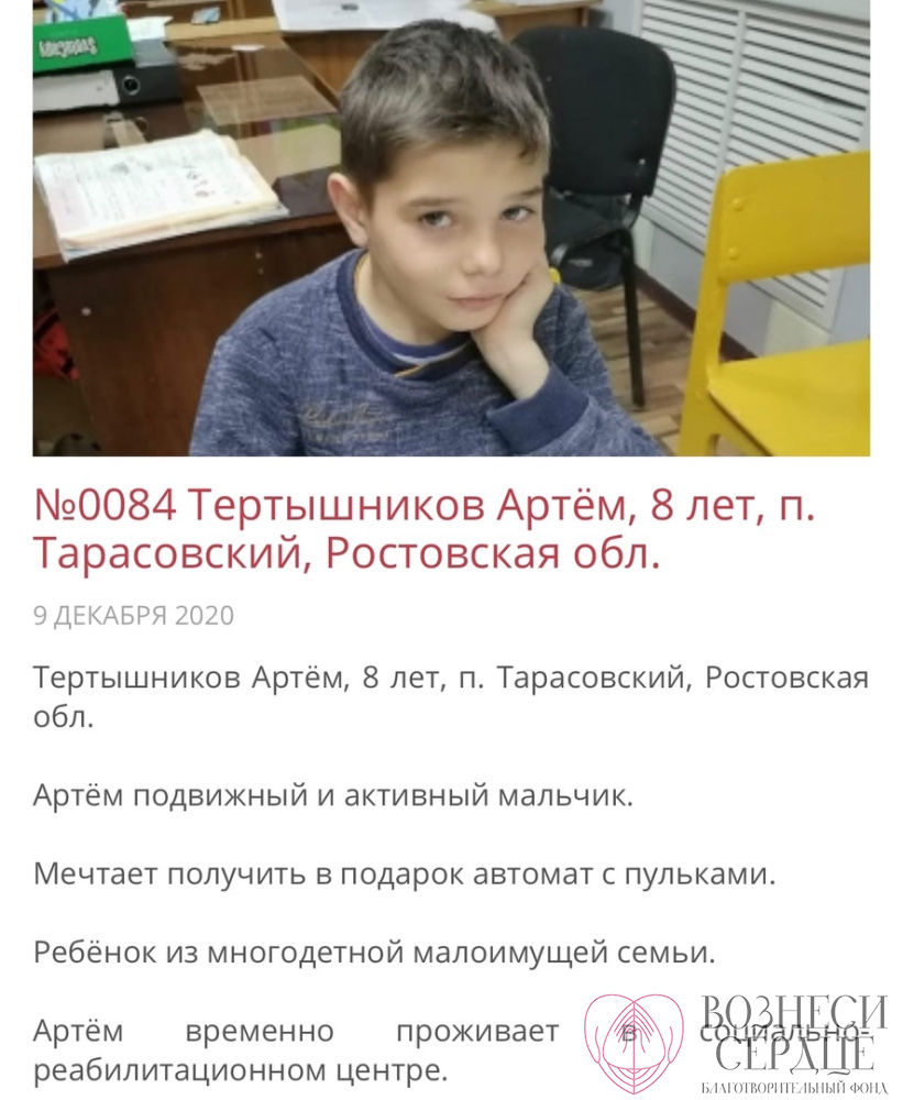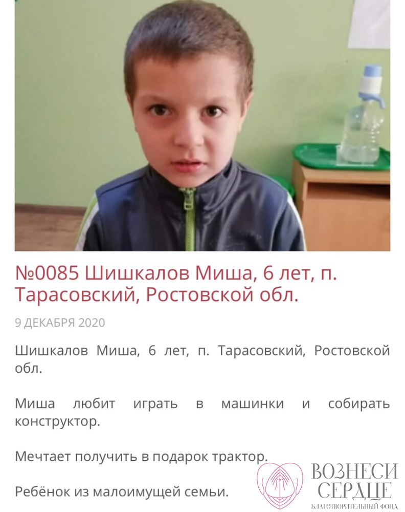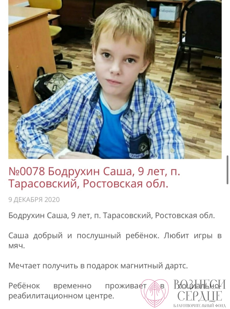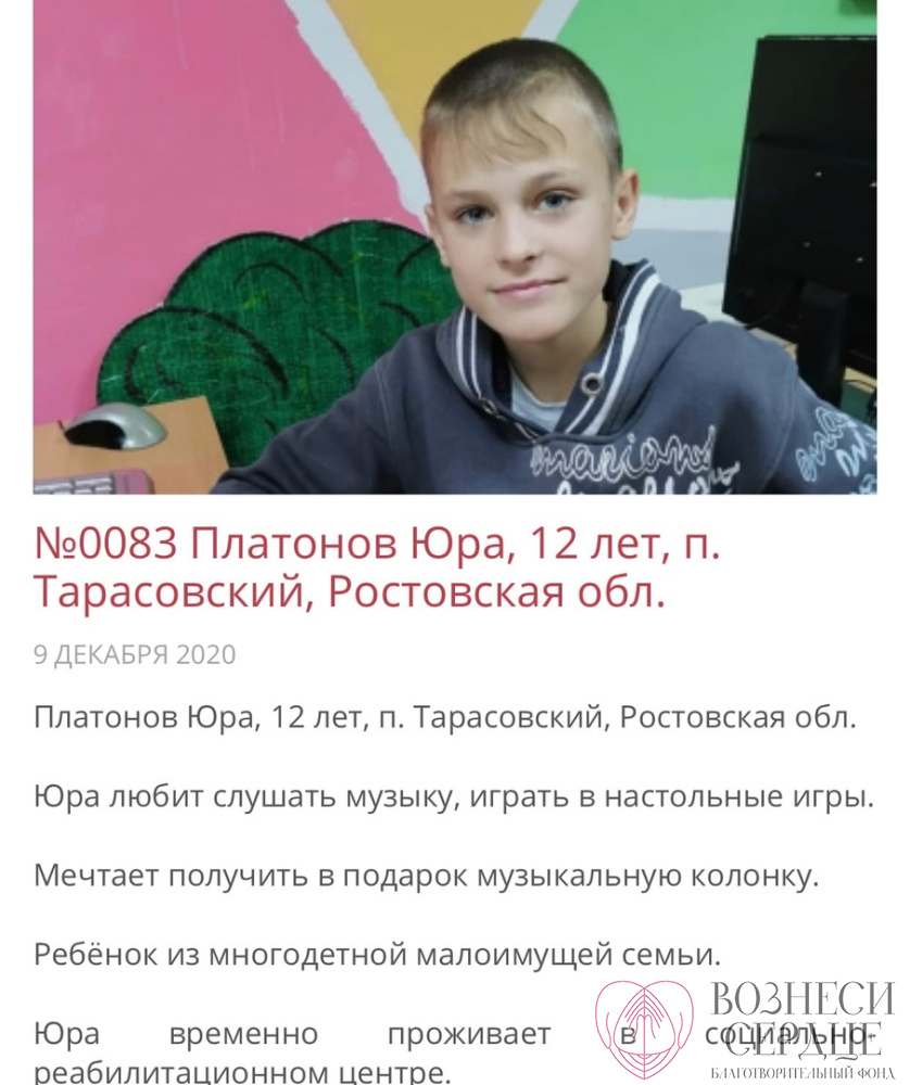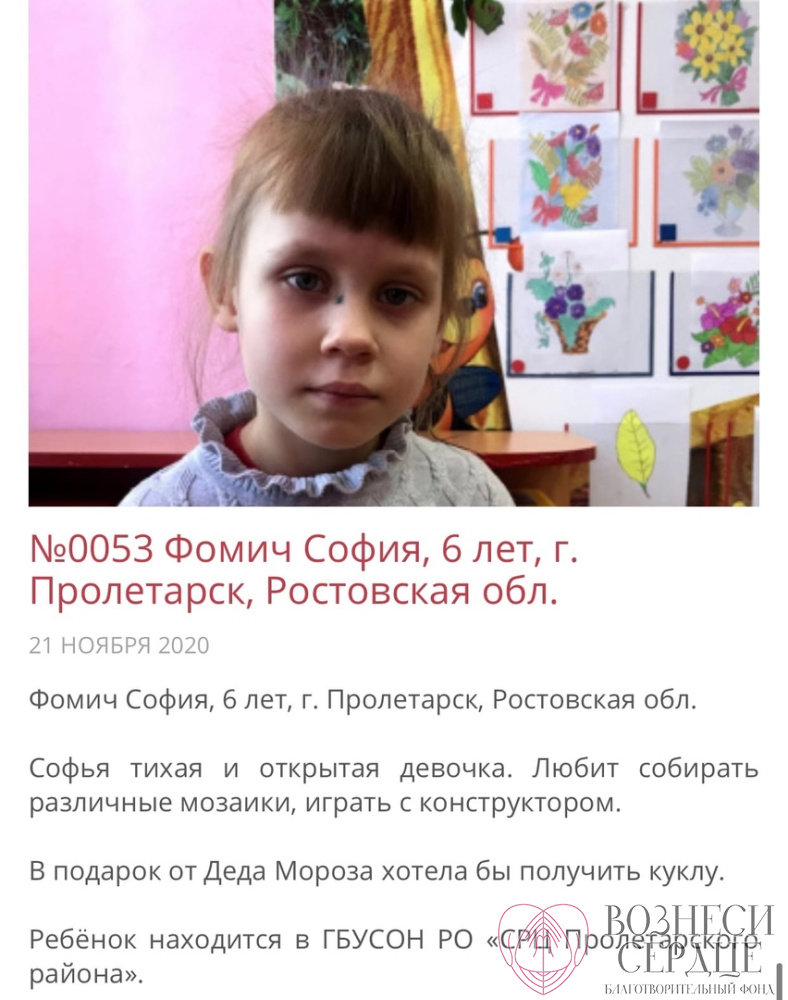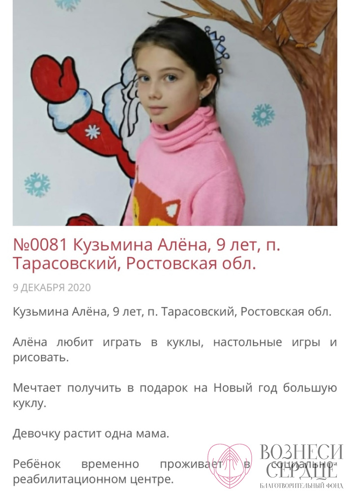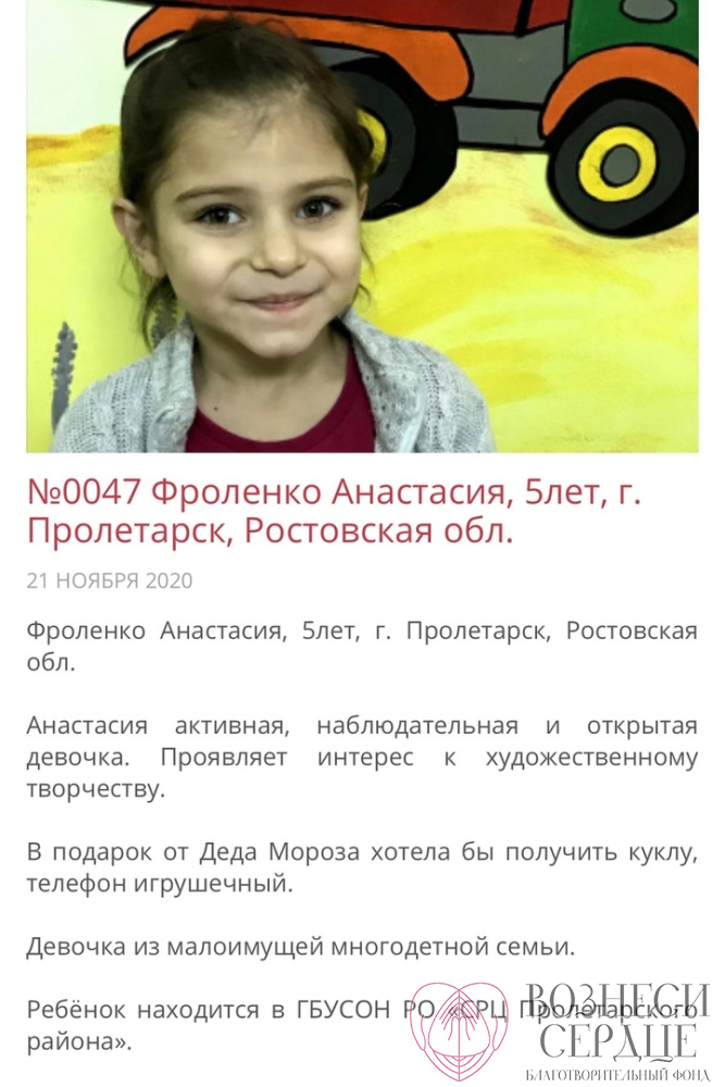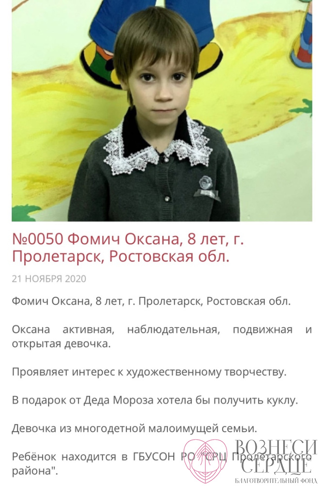 На сайте фонда Вы найдёте деток с разной судьбой. Все эти дети из семей, стесненных в средствах и находятся в разных жизненных обстоятельствах. Но даже в самой грустной ситуации у ребенка в сердце живет своя рождественская мечта!