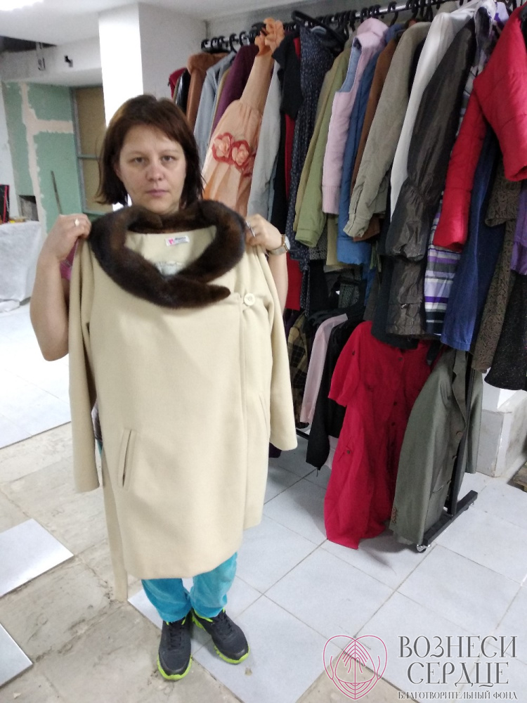 На прошлой неделе очень приятная женщина принесла современные стильные вещи, одной из которых было полупальто кремового цвета с норковым воротником. Красивое… глаз не отвести. Мечта современных модниц! Так вот, шикарное пальто обрело новую хозяйку, которая «влюбилась» в него с первого взгляда. И по фигуре отлично село и прям вот как на неё, многодетную мамочку. Ушла от нас молодая женщина в приподнятом настроении, обещала в новом пальто и сапогах показаться нам в следующий раз. Как же радостно наряжать мамочек, ведь главная их забота – это детишки, как бы их одеть и накормить, а уж о себе и подумать некогда. А тут такой щедрый подарок с доброго плеча.