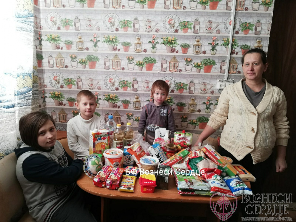 Давно мы помогаем семье Кривоблоцких из г. Печоры Псковской обл. В семье на днях будет пополнение, ждут рождения 5 ребёнка. Доход на такую семью совсем небольшой, поэтому продуктовая помощь для них это большое подспорье!