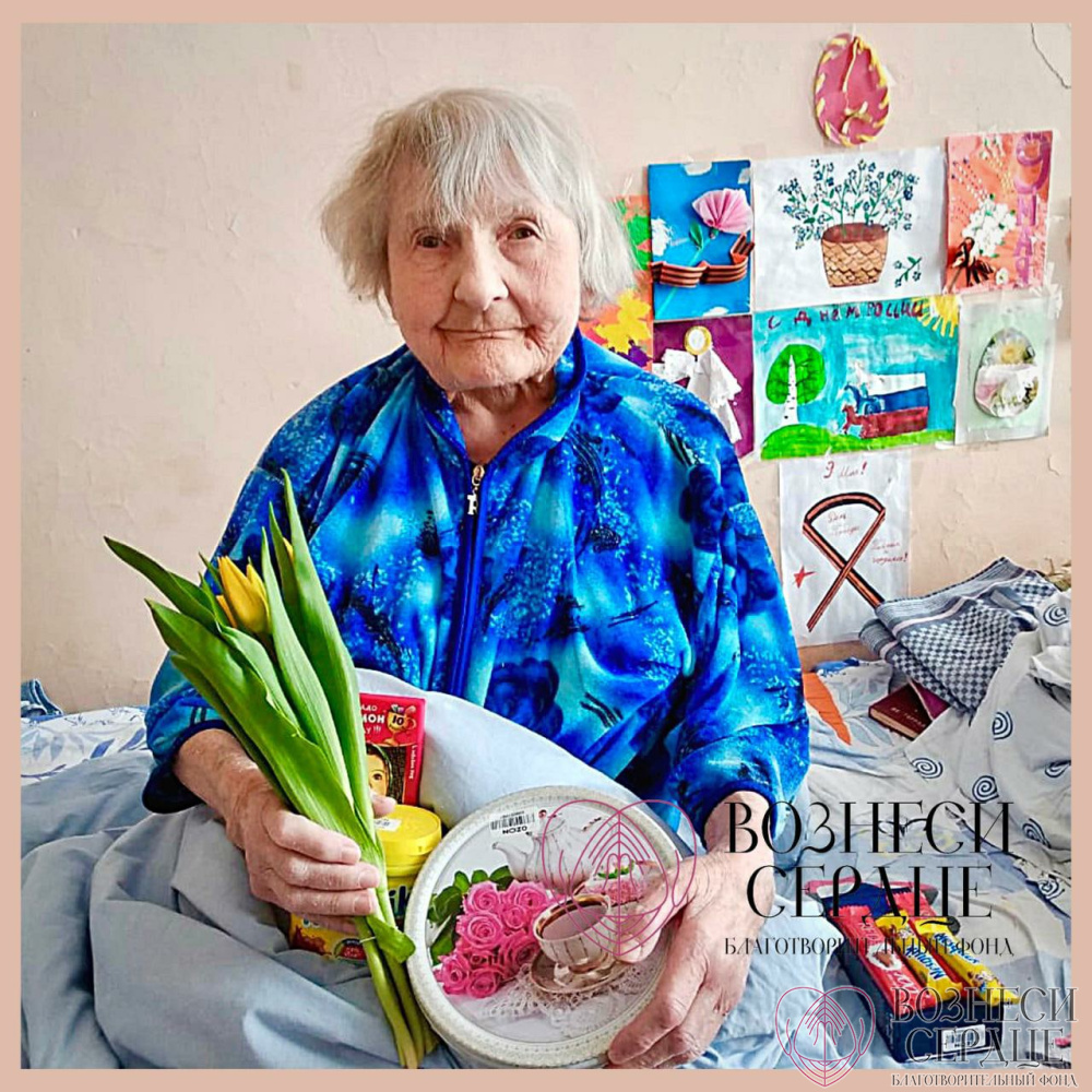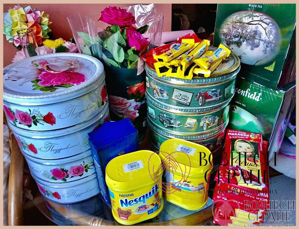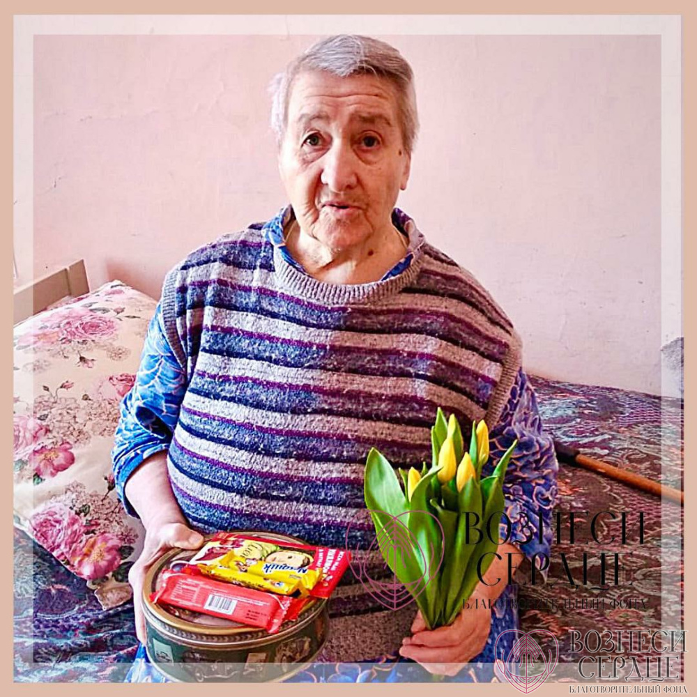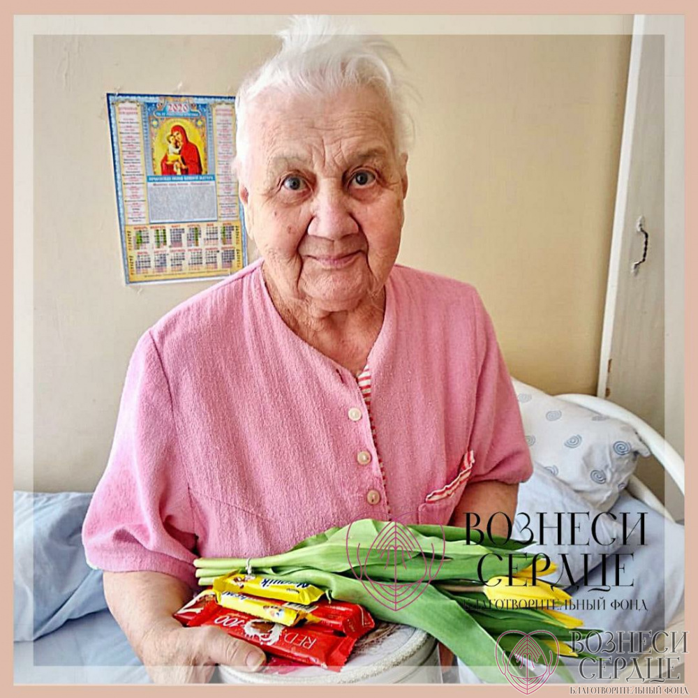 От фонда мы передали домашние сырники из местной кулинарии и сметану. Это было пожелание пожилых людей к празднику. Каждой бабулечке подарили по букету тюльпанов.