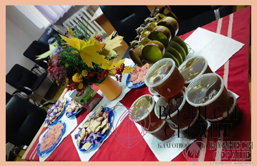 Сегодня здесь чаепитие с мёдом, который мы приобрели, чтобы подарить бабушкам и дедушкам, а также сладостями от доброй Юлии! Она прислала чай, конфеты и мармелад.