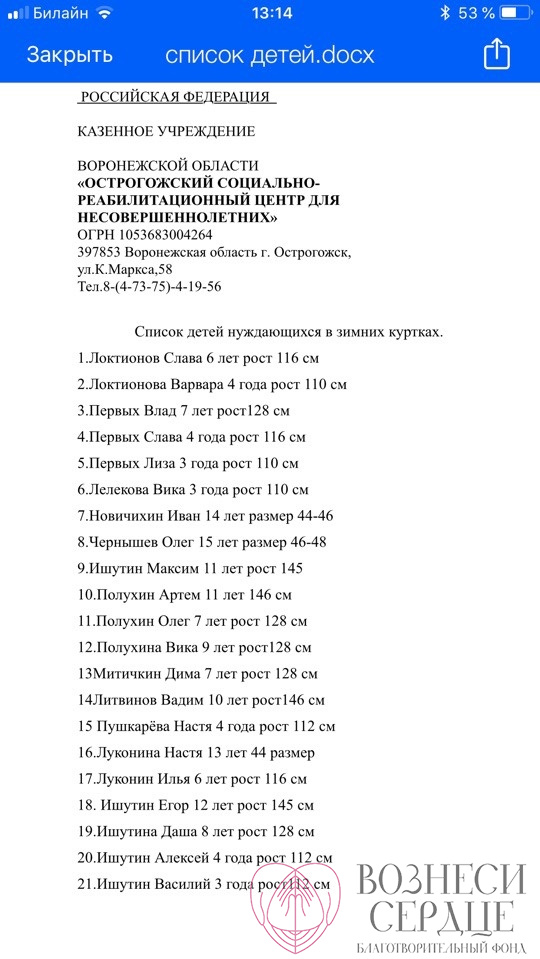 Если вы, дорогие наши помощники, сможете помочь, то мы будем очень вам признательны. Мы прикладываем список деток с размерами и их именами.