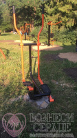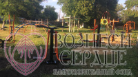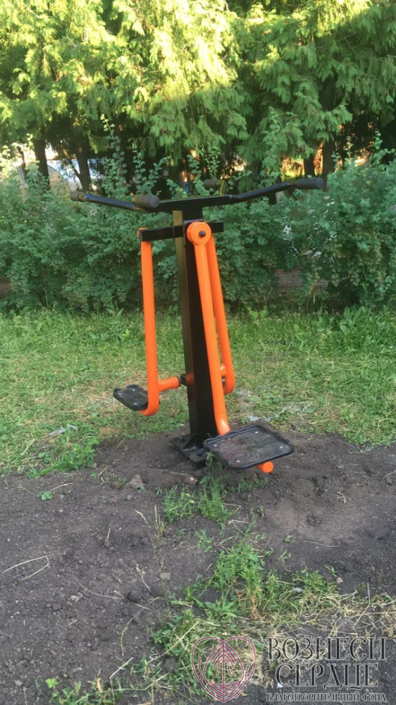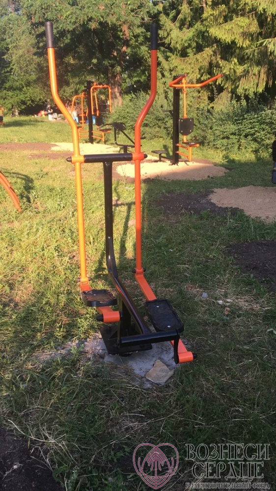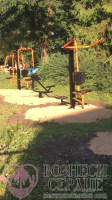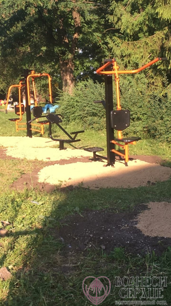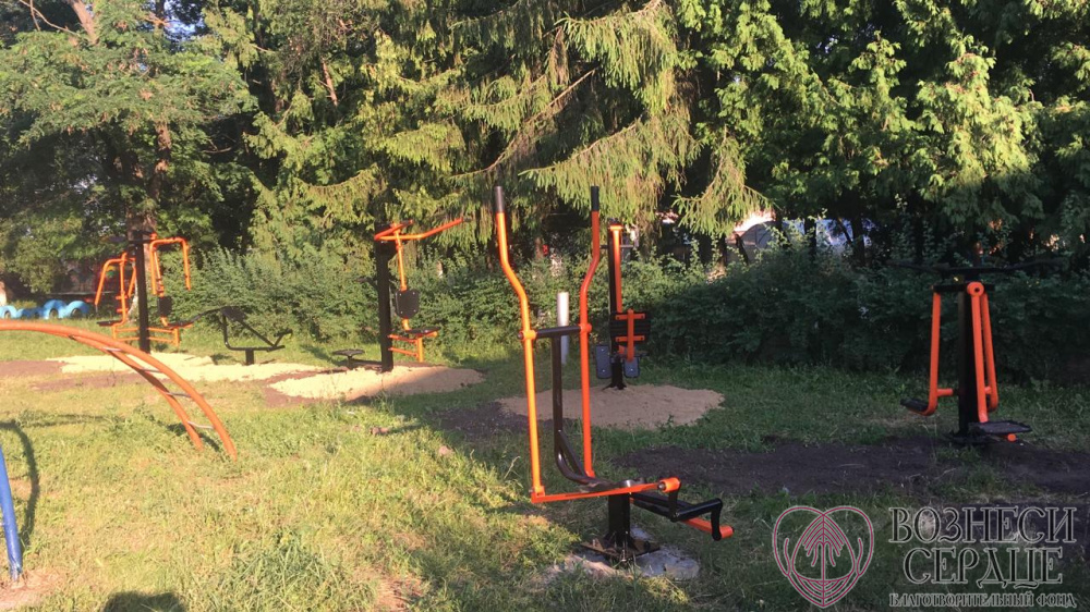 На детской площадке уже установлены уличные тренажеры. Дети с удовольствием занимаются на свежем воздухе.