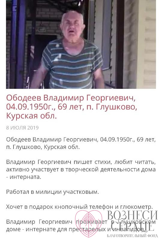 – Ободеев Владимир Георгиевич отметил вчера свой день рождения, но продолжает ждать свой подарок мечту. Хочет в подарок кнопочный телефон или глюкометр.