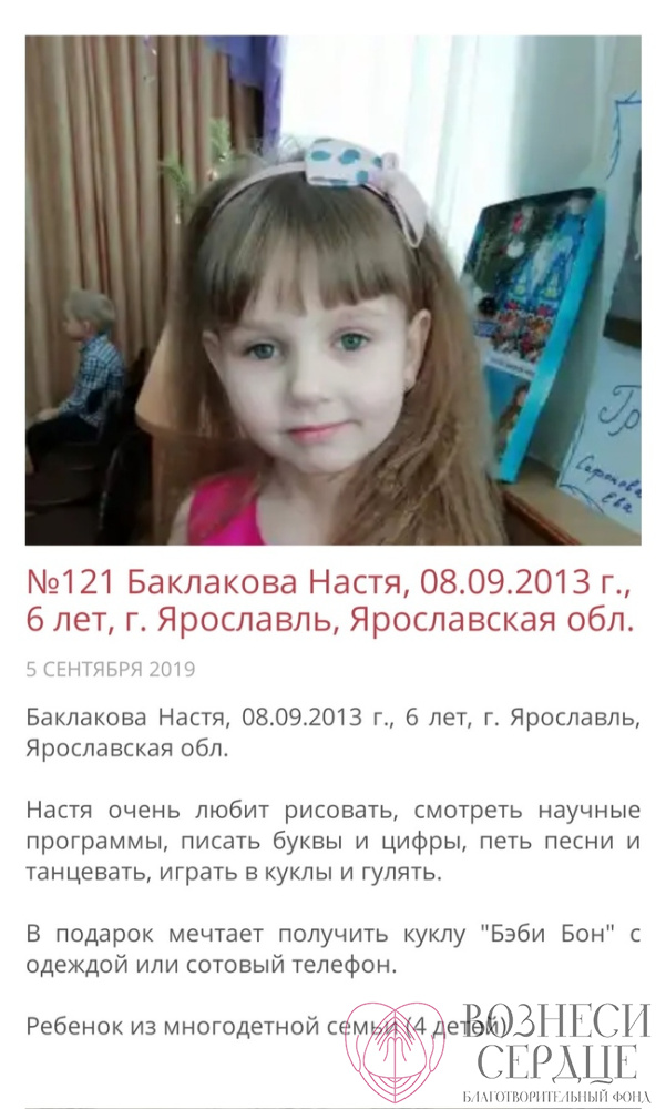 - Баклакова Настя из красивого города Ярославля мечтает получить куклу « Беби Бон». Ей исполнится 6 лет 8 сентября. Прекрасный возраст для игры в куклы. Кто хочет порадовать девчушку?