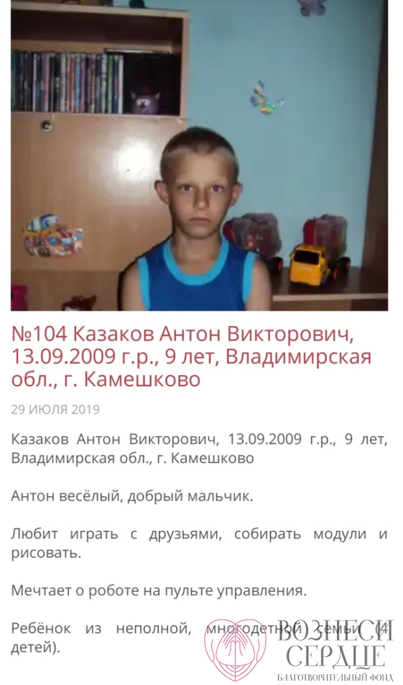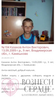 - Казаков Антон - весёлый, добрый мальчик. Любит играть с друзьями, собирать модули и рисовать. День рождения ему 13 сентября, ему исполнится 10 лет!