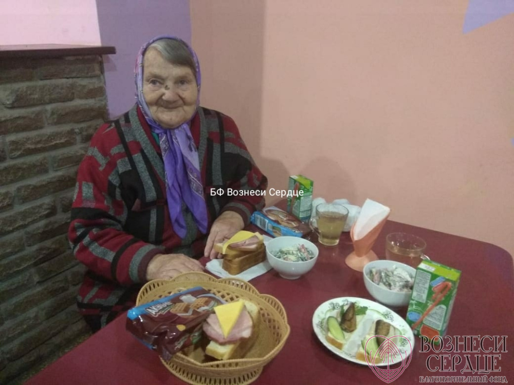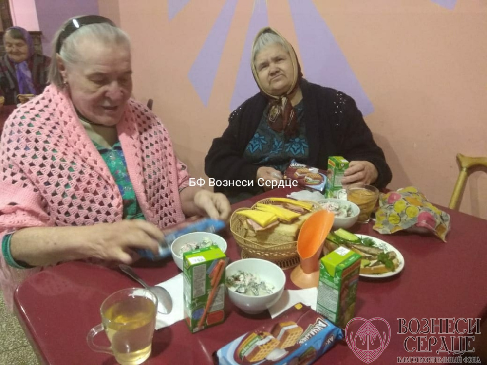 Пожилых людей угостили вкусными бутербродами со шпротами и колбаской. К обеду добавили вкусный салатик из помидоров и огурцов, а на полдник выдали сладости. Угощений хватило не на один день. Да и праздничных выходных дней много, поэтому очень радостно, что удалось скрасить эти дни.
