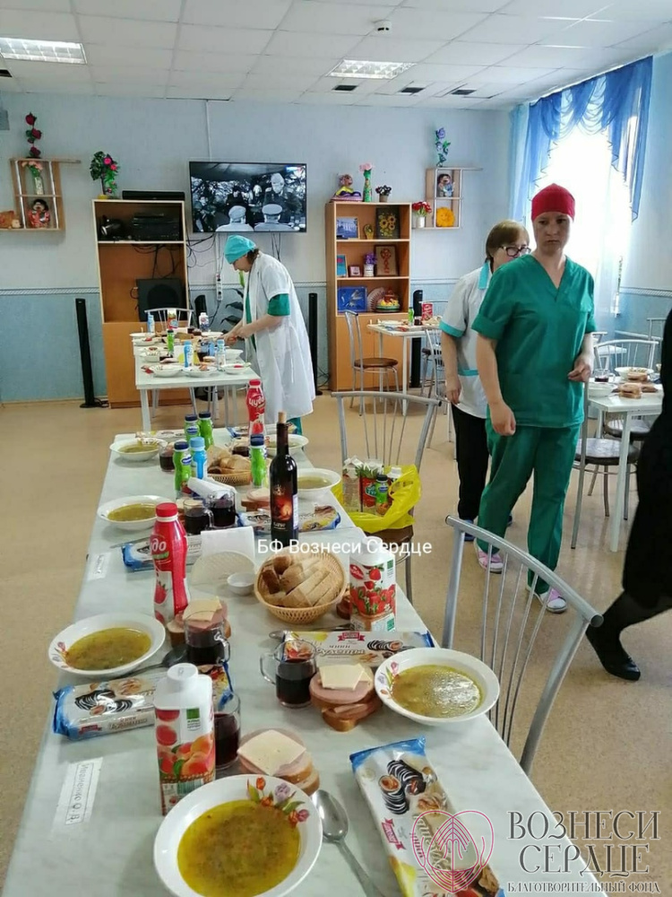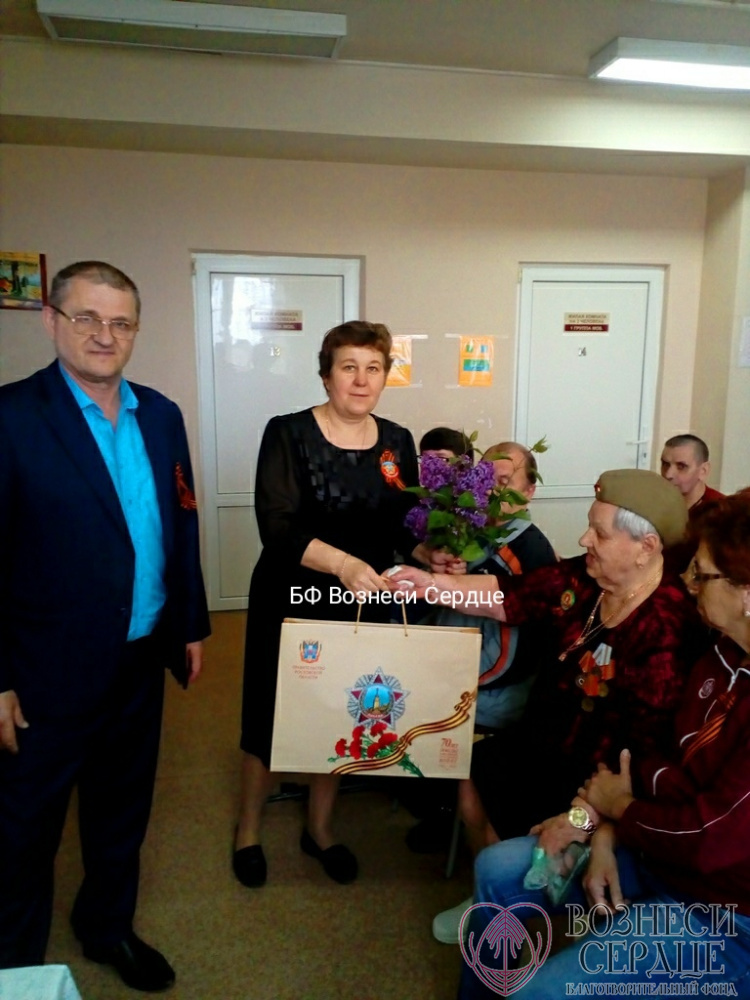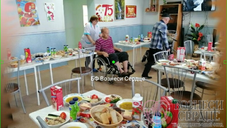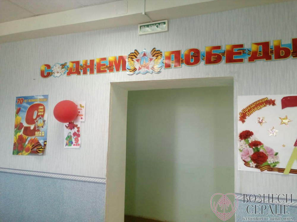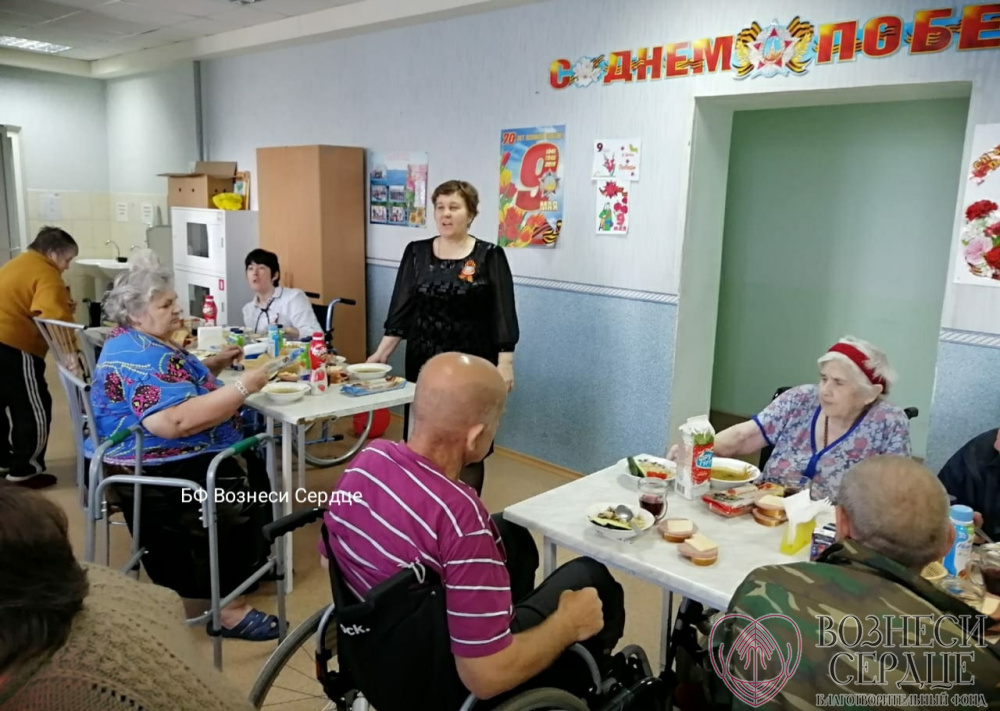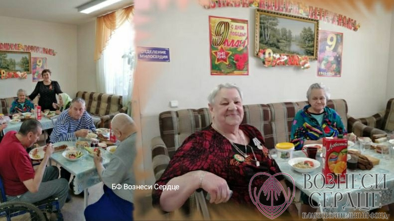 «В День Победы, 9 мая, в нашем доме-интернате был организован праздничный обед: бутерброды с колбасой и сыром, помидоры, огурцы, фронтовые 100 гр. «Кагора» и сок для 53-х проживающих от БФ «Вознеси сердце». Каждому подопечному были подарены памятные кружки, по 1 кг шоколадных конфет, рулету и йогурту. Труженикам тылы Свириденко Варваре Свиридовне, Кащеевой Анне Макаровне, Саламатиной Пелагее Григорьевне были вручены подушки, шампунь и носки, а Сусла Марии Арсентьевне - приёмник. Мы приняли участие в Флеш - мобе и исполнили песню «День Победы» в столовой, украшенной плакатами «9 Мая», которые нам помог купить фонд.