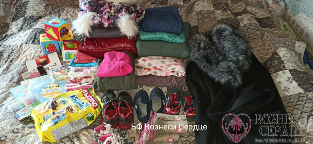 – Добрый Сергей из г. Белгорода прислал семье много добротных вещей. Здесь много одежды для матери семьи – всё идеально подошло. Пальто просто шикарное. Детишкам подошла обувь. Книжки замечательные, принялись сразу читать!