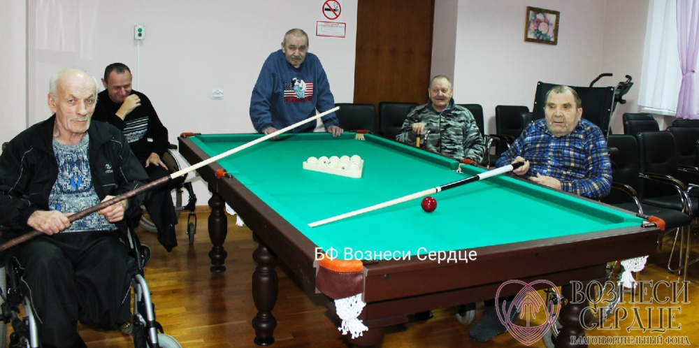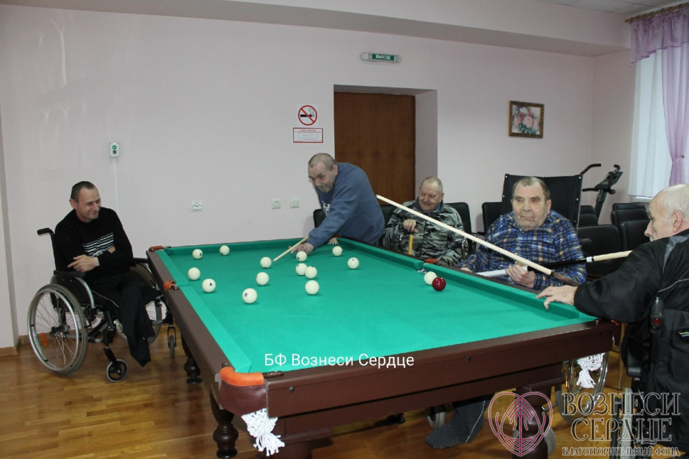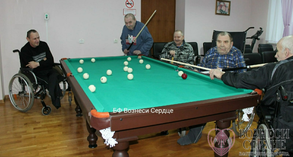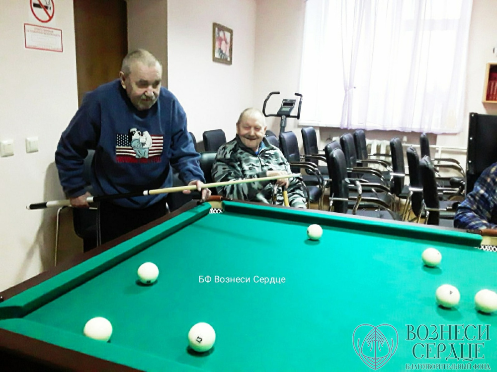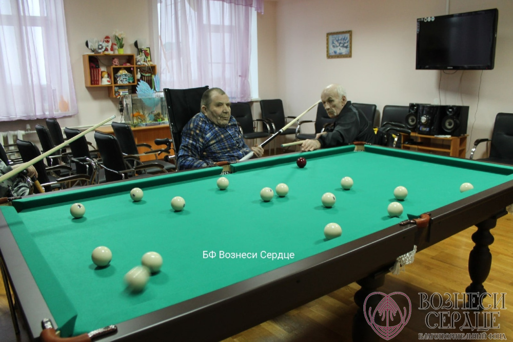 Дорогие друзья, наш подарок – бильярдный стол – уже радует пожилых людей в Гдовском доме-интернате. Собираются мужчины теперь в актовом зале не только на мероприятия, но и поиграть в любимую игру, пошутить и вспомнить годы молодые.