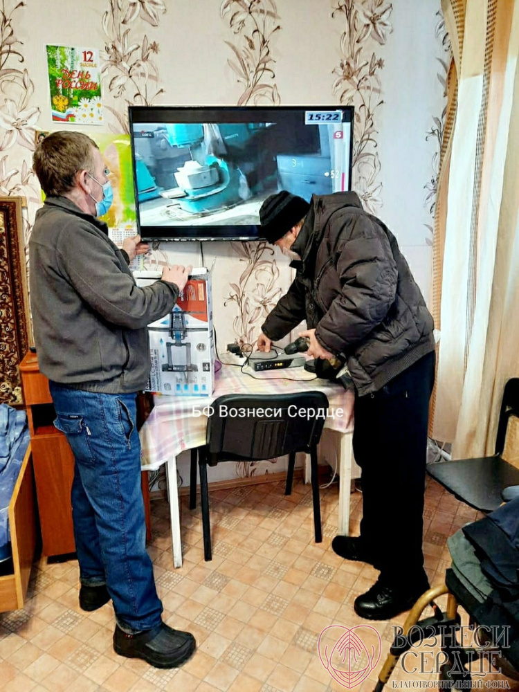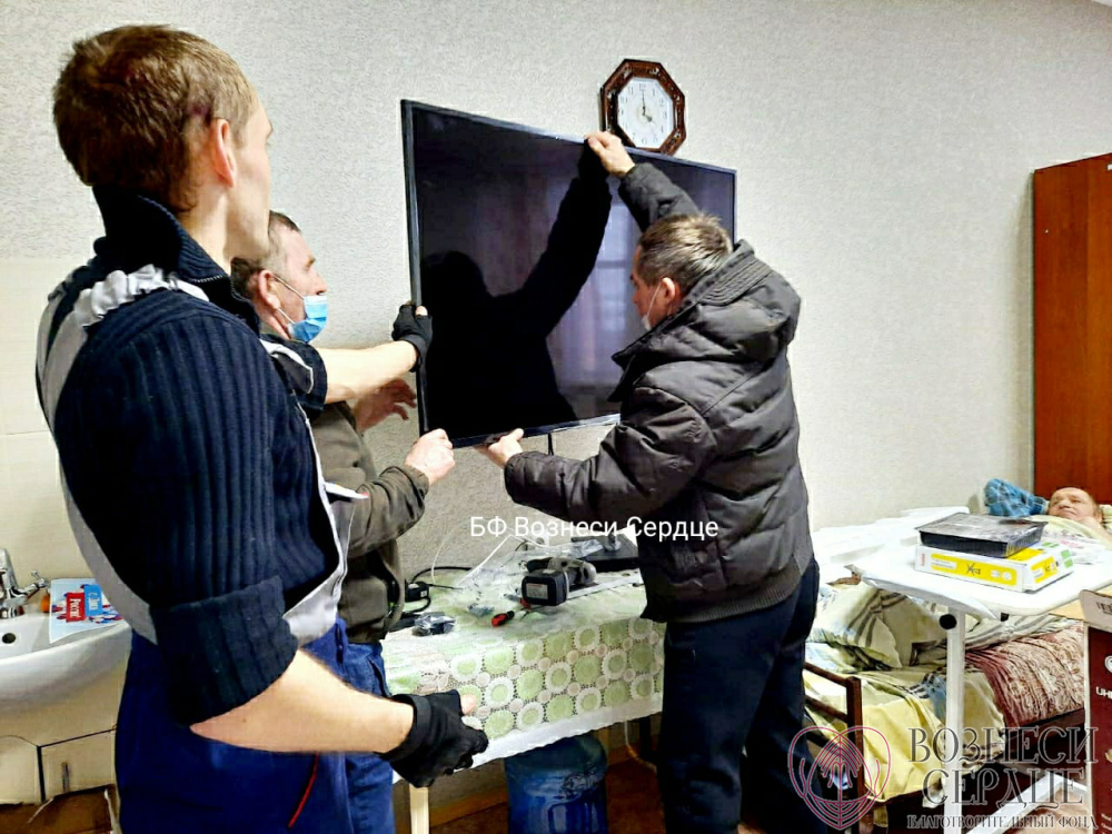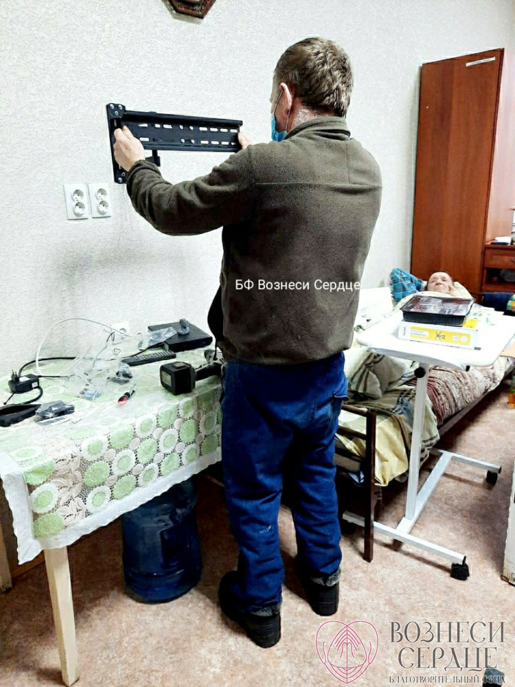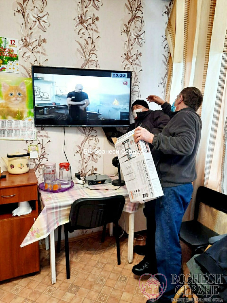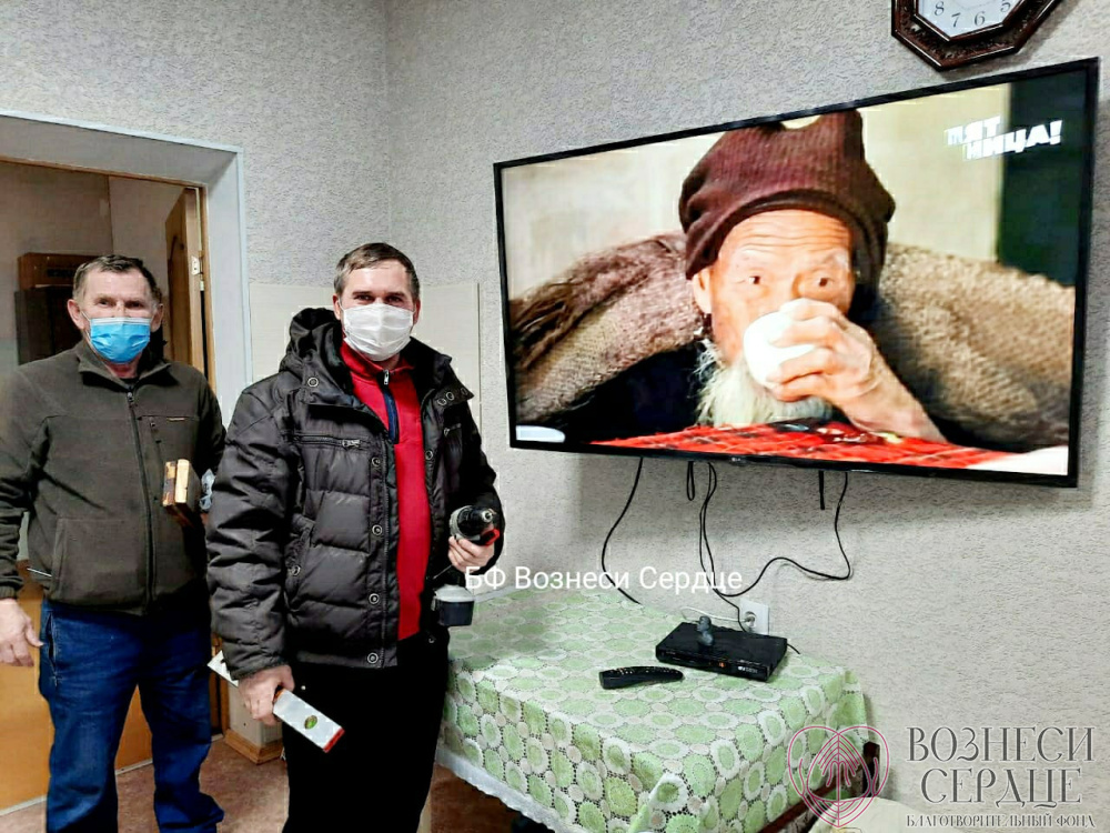 Благодаря вам мы подарили на 85-летие Свинтицкому Виталию Алексеевичу телевизор, а в другую комнату купили большой телевизор и комплект «Триколор ТВ» для четверых маломобильных мужчин. Закрепить их надёжно на стене удалось на этой неделе, потому что мастер долго болел, а сделать эту работу было некому.