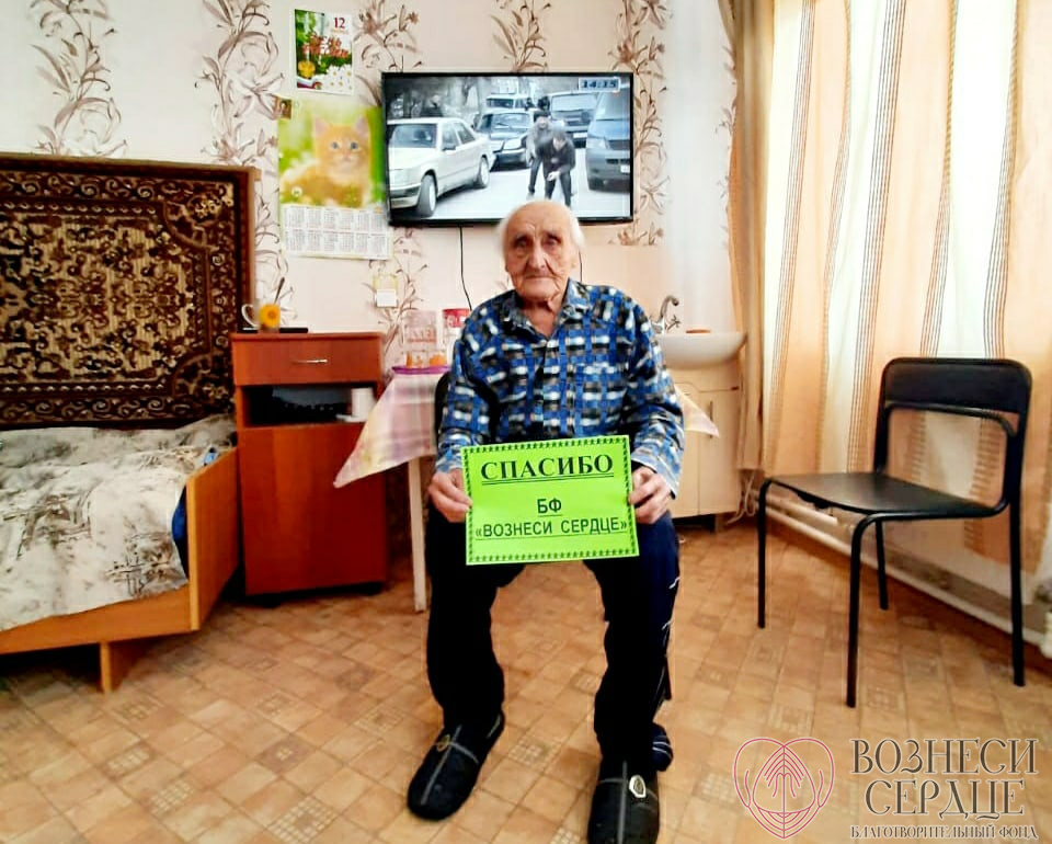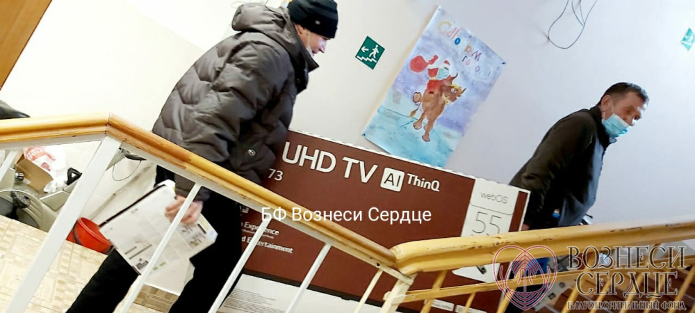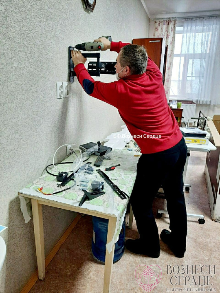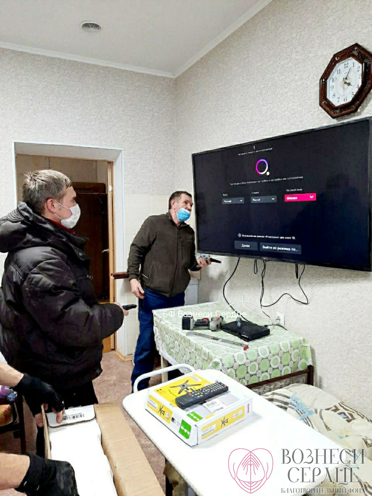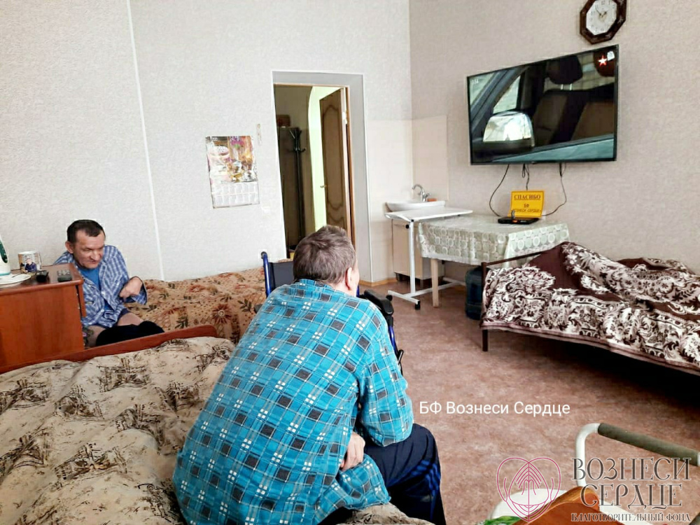 Благодаря вам мы подарили на 85-летие Свинтицкому Виталию Алексеевичу телевизор, а в другую комнату купили большой телевизор и комплект «Триколор ТВ» для четверых маломобильных мужчин. Закрепить их надёжно на стене удалось на этой неделе, потому что мастер долго болел, а сделать эту работу было некому.