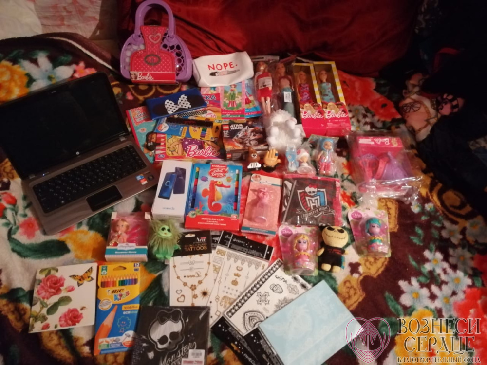Эвелина Рочева из Краснодара прислала столько интересных вещей для девочек, чего только здесь нет: игрушки, блокнотики, карандаши, сумочки, несколько кукол (теперь не придется играть по очереди), красивая одежда, ноутбук. Не забыла она и про мечту единственного парнишку в семье. Мечта Стаса была – телефон любой рабочий, потому как всегда приходилось просить у старшей сестры, а купить свой совсем не было возможности. Теперь у него будет свой личный смартфон, благодаря помощи доброй Эвелины.