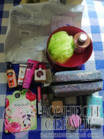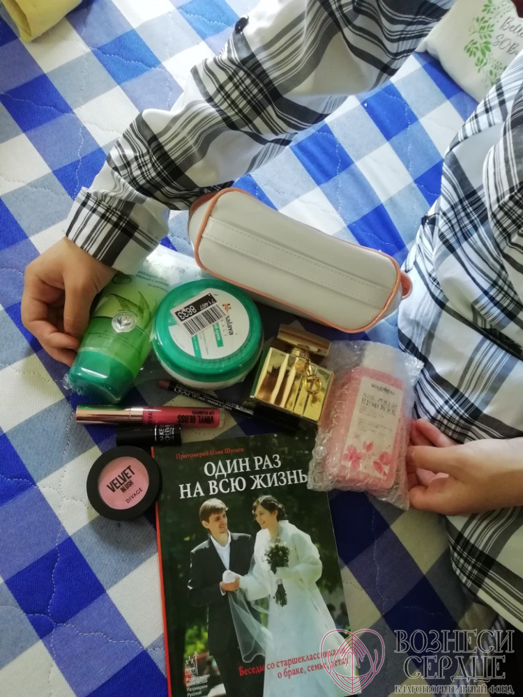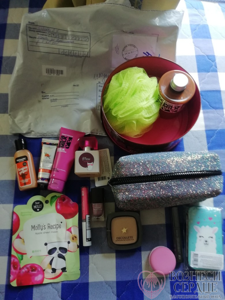 –Спасибо Горбачёвой О.И. из г. Москвы за много счастья для Оксаны. Здесь косметика и много милых вещичек, которые так любят девчонки.
