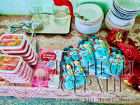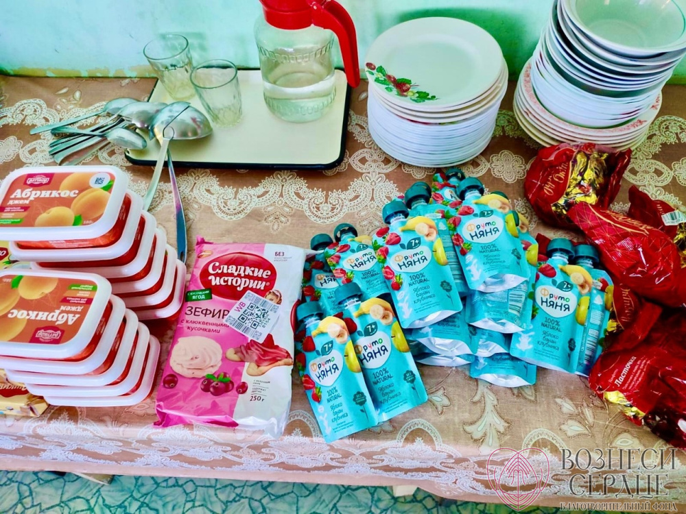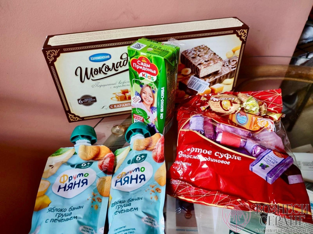 Леонтина прислала соки, фруктовые пюре и конфеты. Ангелина зефир и калоши. Наталья соки, вафли, конфеты, пюре и средства гигиены. Анна конфеты, пюре и подгузники.