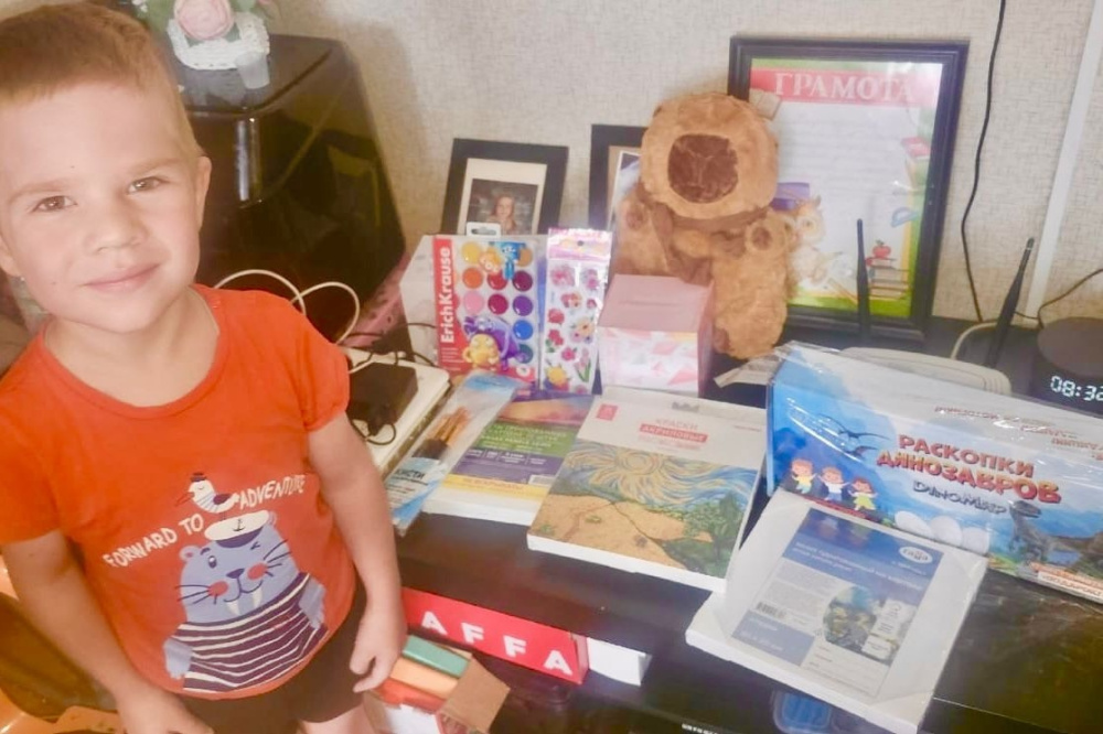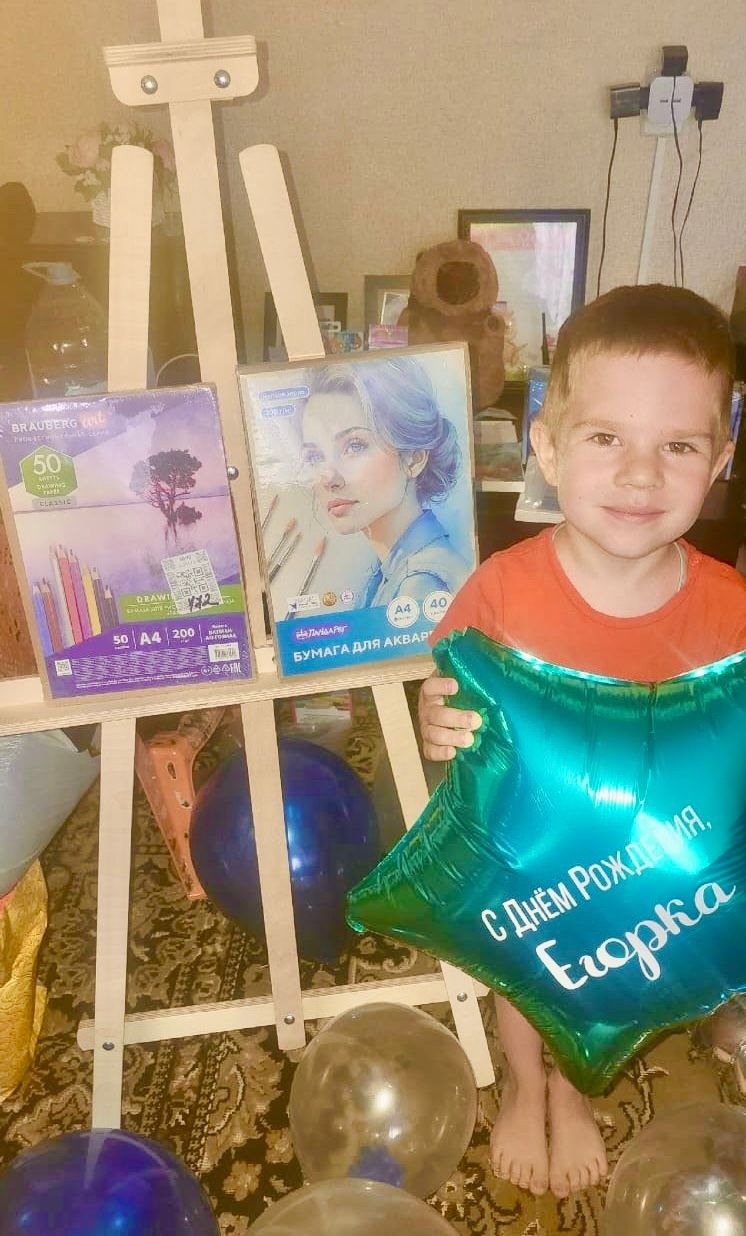 Ребенок любит рисовать и давно мечтал о мольберте, чтобы чувствовать себя настоящим художником. Щедрая дарительница прислала не только мольберт, но и много всего интересного для Егорки. Здесь ночник, кружка «Морковка», капибара с рюкзачком, игра «Раскопки динозавров», а для рисования акриловые краски, холсты и кисти. Егорка просто светился от счастья! А как были все удивлены праздничному торту, пирожным, сокам и большой пицце! Для многодетной малоимущей семьи это просто чудо!