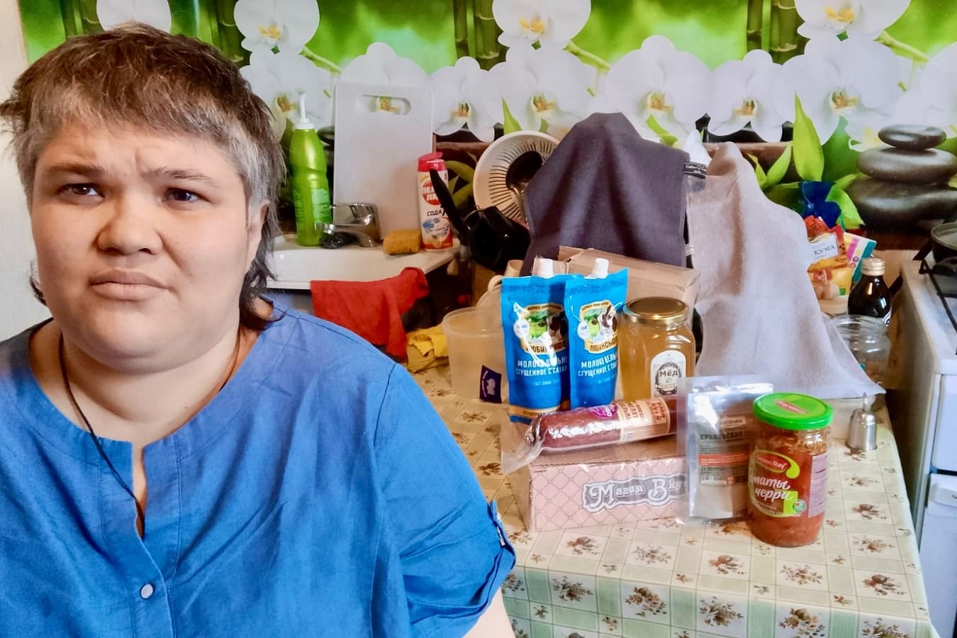 Здесь мёд, сгущённое молоко, колбаса и др. Для семьи это настоящий праздник! Такие продукты они редко себе могут позволить, поэтому обычный будний день стал светлее и радостнее!