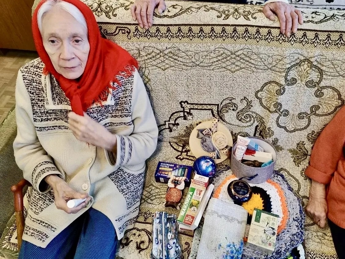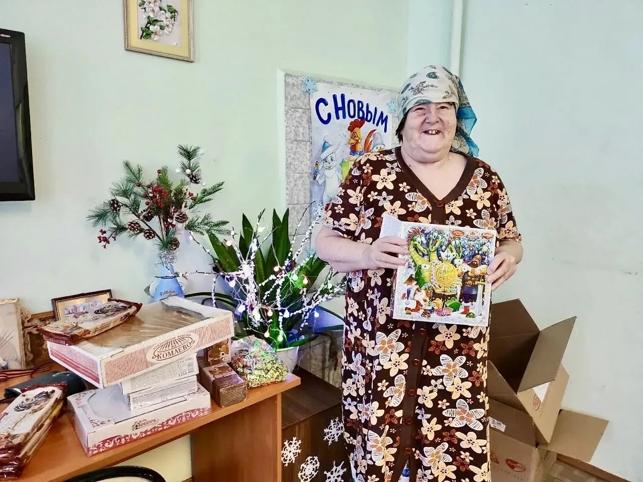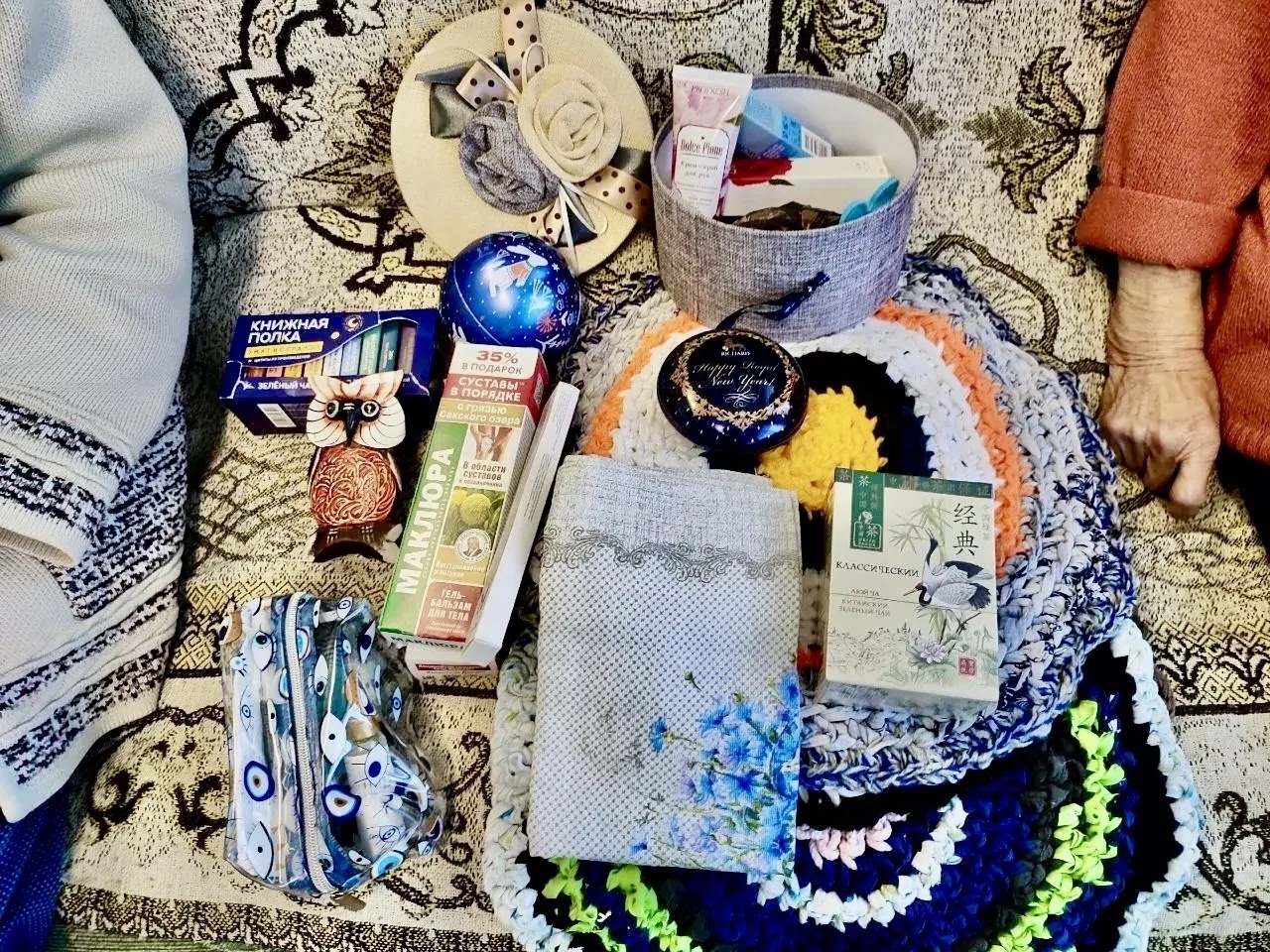 «В преддверии Нового года и Рождества в отделение милосердия от нашего давнего друга Елены пришла большая посылка с подарками для бабушек и дедушек. Все с огромным интересом рассматривали красивые коврики, связанные лично Еленой! А также другие милые предновогодние сюрпризы. Дедушке Юрию Васильевичу в самый раз пришлись прекрасные весенние ботинки. Спасибо Елене за внимание, доброту и заботу!