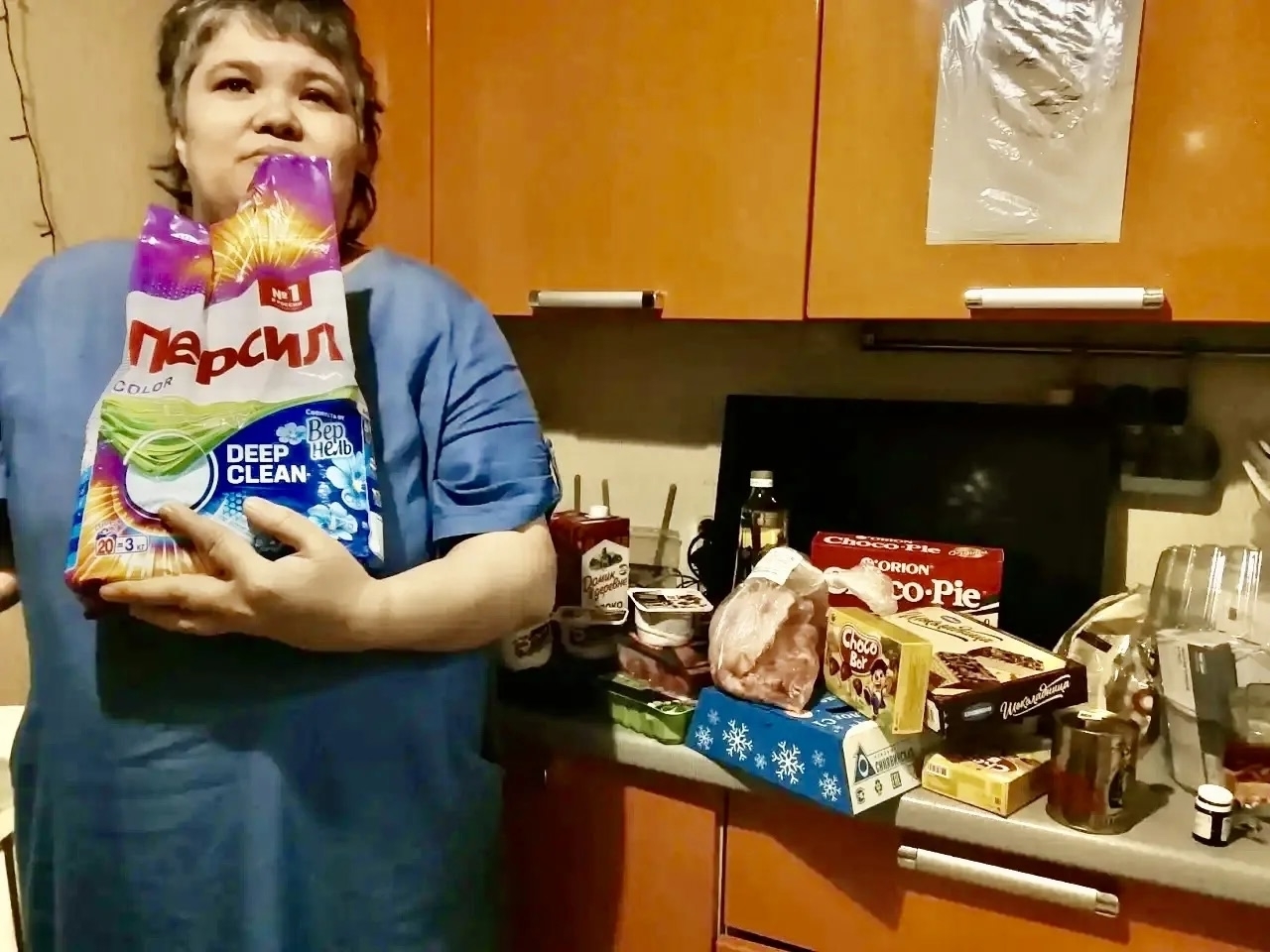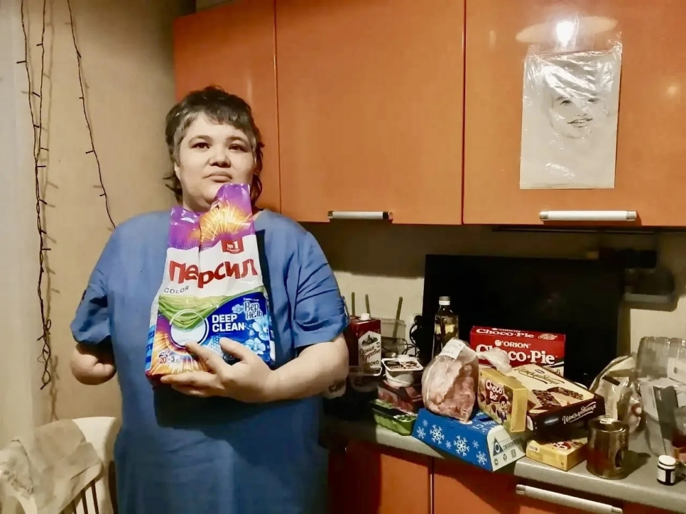 В рамках программы «Помощь семьям» дарительница Анна передала большой продуктовый набор для семьи Муравьёвых. Курьер доставил к порогу всё самое необходимое: молочные продукты, рыбу, колбасу, яйца, сладости и бытовую химию. Для Аллы этот визит стал праздником до слез.