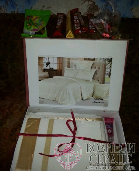 Всё такое красивое, много новых вещей с этикетками, постельное бельё, сладости! Сегодня праздник у семьи. Лена уже примерила наряды, платье ей очень хорошо!
