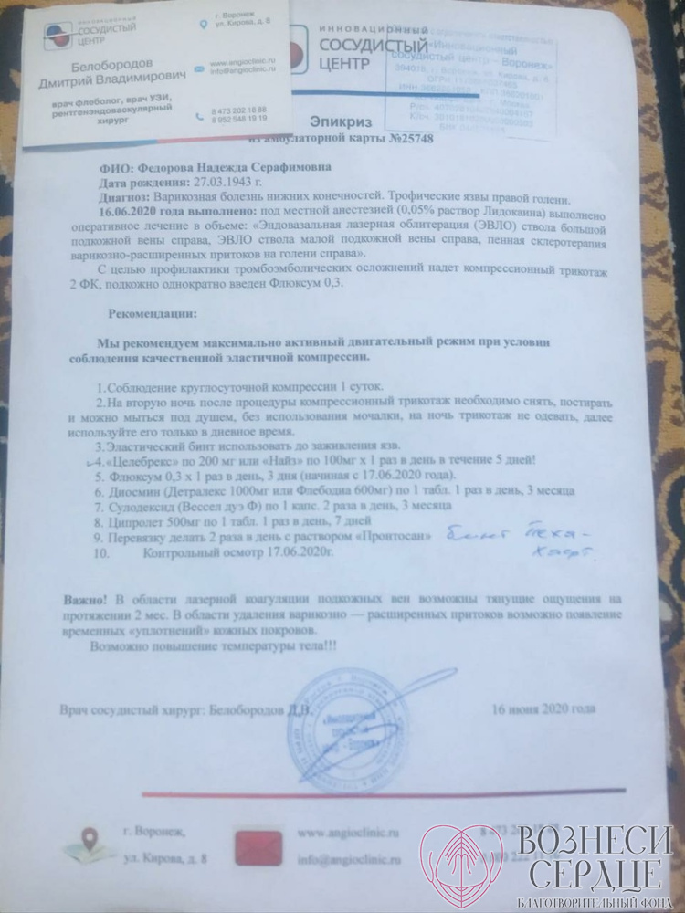 На днях бабушке сделали операцию в Инновационном сосудистом центре г. Воронеж. Операция прошла успешно, но боли пока сохраняются.